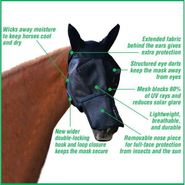 The new standard for protection and comfort, our horse fly mask design keeps horses cool, dry and comfortable using high-tech fabrics originally developed for human performance clothing. It's designed to stay put with two way controlled stretch fabric on the crown and jowl, extended fabric behind the ears and a strong double locking hook and loop closure featuring wider Velcro. It's also designed to protect, with structured eye darts and a mesh that blocks 80% of UV rays. Plus, rolled inner seams prevent rubs and irritation. Assured to last through one fly season. Horse size with ear coverage and removable nose canister.