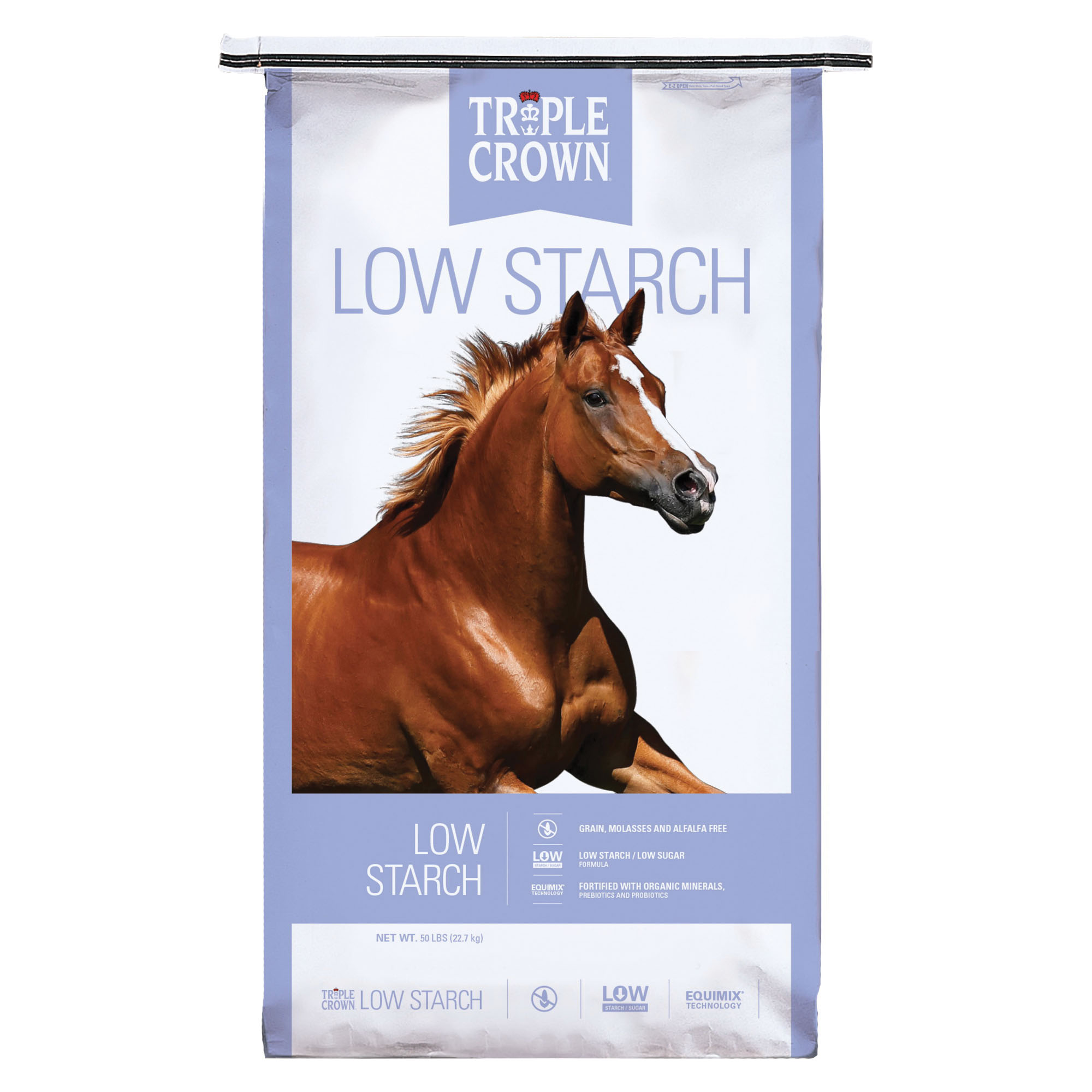 A super premium pelleted feed with no soybean meal for mature horses. triple crown low starch is grain, alfalfa and molasses-free making it ideal for horses with insulin-resistance, HYPP, PPID, EPSM or PSSM. Formulated specifically for mature horses, Triple Crown low starch is a pelleted low starch and sugar (NSC) feed for horses requiring a lower diet for metabolic reasons or for horse owners seeking calmer behavior from horses. Featuring fewer carbohydrates than hay and pasture, Triple Crown low starch can be used as a complete feed to replace all or part of the forage portion of the diet. This feed is also suited for those who tend to have allergies, ideal for HYPP horses as the feed contains a low potassium level and works well for senior horses in winter in order to avoid the bricking of textured feeds.