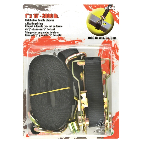 Erickson Strap, Working Load Limit: 1000 lb, End Type: J-Hook, Adjustment Type: Ratchet, 15 ft L, 1 in W, Black, Breaking Strength: 3000 lb