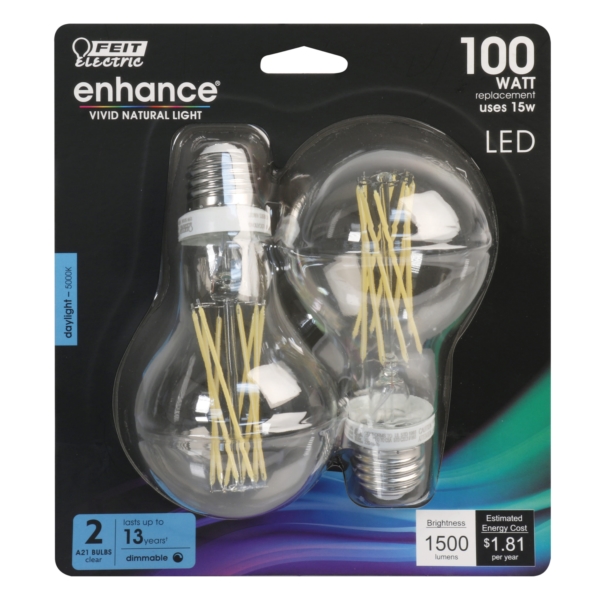Enjoy all the benefits of advanced LED energy-saving technology with the Feit Electric BPA19100CL950CAFI2RP 100 W A21 LED light bulbs with traditional glass design. This 5000K daylight bulb is dimmable and will replace 100 W equivalent incandescent bulbs. It produces a similar light output (1500 Lumens), uses 15 W of electricity and is omni-directional. Get instant on to full brightness with relatively cool running performance. Feit Electric glass filament white A21 light bulbs have an average life of 15,000 hrs are RoHS compliant and are 100% mercury-free. Choose a dependable bulb for residential or commercial applications.