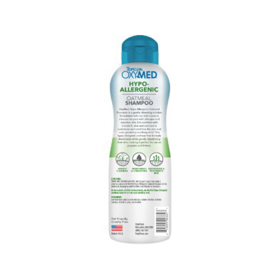 OxyMed hypo-allergenic oatmeal shampoo is a gentle cleansing solution formulated with our mild coconut cleanser for pets with allergies and sensitive skin. It is enriched with vitamin E, aloe and oatmeal to moisturize and condition the skin and coat, providing soothing relief. This hypo-allergenic and tear-free formula deodorizes while gently rehydrating their skin, making it ideal for use on puppies and kittens.