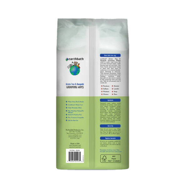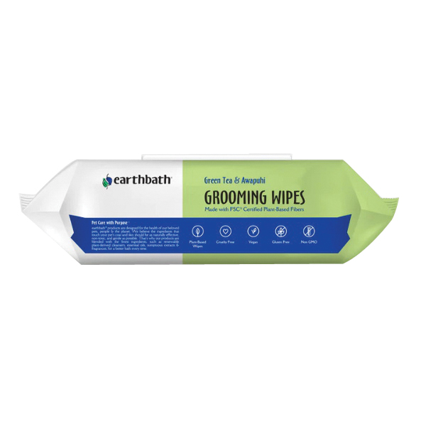 earthbath® green tea and awapuhi grooming wipes safely and easily wipe away dirt and odors between baths, while leaving coats soft and shiny. Use these handy plant-based wipes to clean pets' dirty paws and undercoat or to remove dander, drool, discharge and cling-ons. Mild cleansers deodorize, while green tea and awapuhi leave pets smelling heavenly fresh. Avocado oil, aloe vera and vitamin E help moisturize both coat and skin. Safe for daily use on all animals over six weeks old.