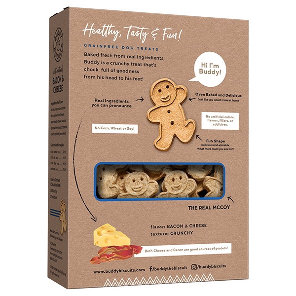 Buddy Biscuits Oven Baked Treat, Flavor: Bacon, Cheese, Net Content: 16 oz, Ingredients: Whole Wheat Flour, Bacon, Cheese, Canola Oil, Mixed Tocopherols (Natural Preservative), Nutritional Information: 15% Crude Protein, 6.5% Crude Fat, 3% Crude Fiber, 10% Moisture