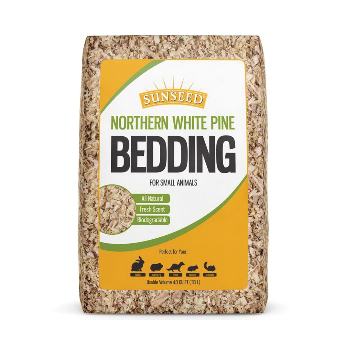 Naturally absorbent, shredded soft wood pine makes an excellent bedding and litter for many types of small animals. The unique texture encourages your pet's natural desire to nest and burrow, while its natural absorbency keeps cages clean and prevents odors. Shavings in Sun seed Northern white pine bedding go through a special multi-step screening process to remove fine dust that could be harmful to your pet's respiratory system, making it safe for both your pet and your home.