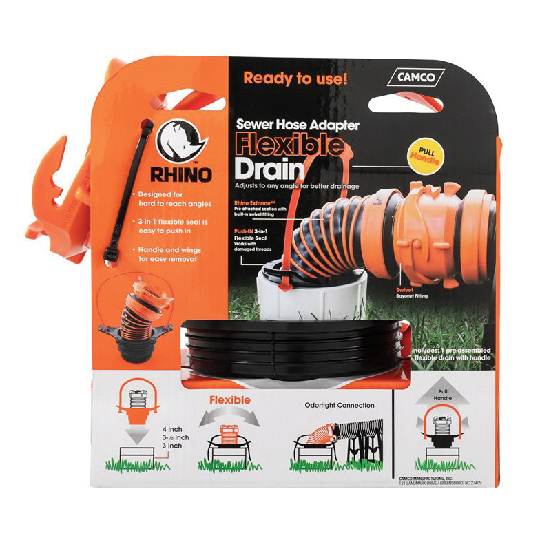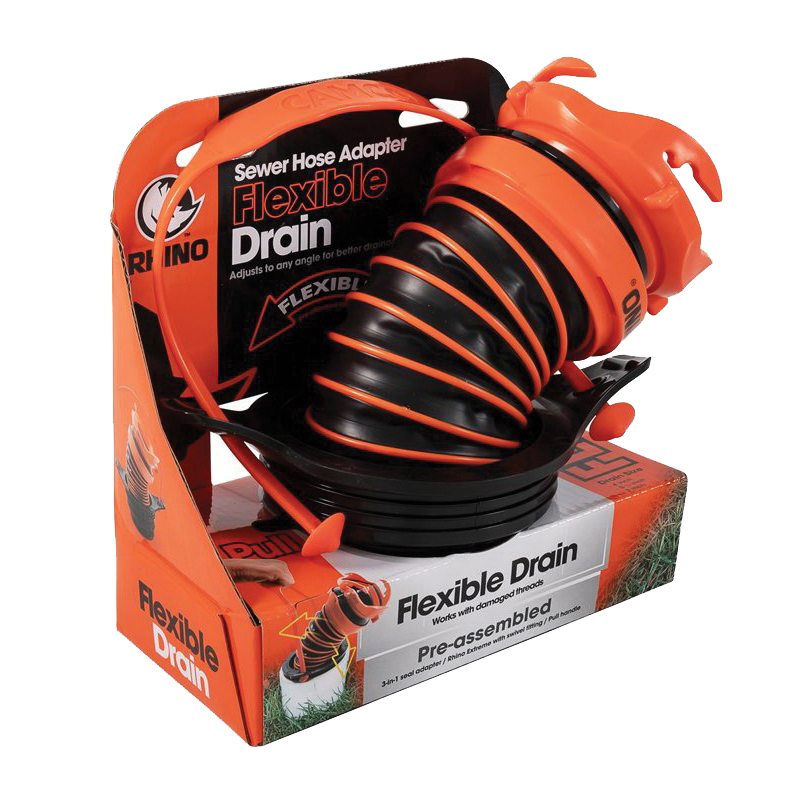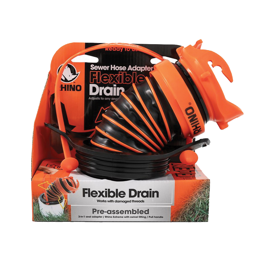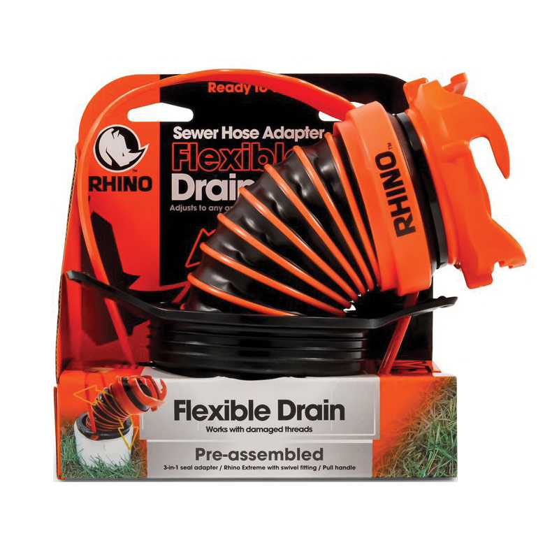 The Rhino sewer hose adapter flexible drain is designed to connect your rv sewer hose to sewer drains with hard-to-reach angles. The attached three-in-one flexible seal is easy to push in and can fit in 3, 3-1/2 or 4 in inlets. It even works with damaged threads for an odor tight connection. The attached pull handle and wings help with easy removal. The Rhino sewer hose adapter flexible drain includes a pre-assembled Rhino extreme hose with a 360 deg swivel bayonet fitting to attach to your sewer hose, a three-in-one seal adapter and a pull handle.