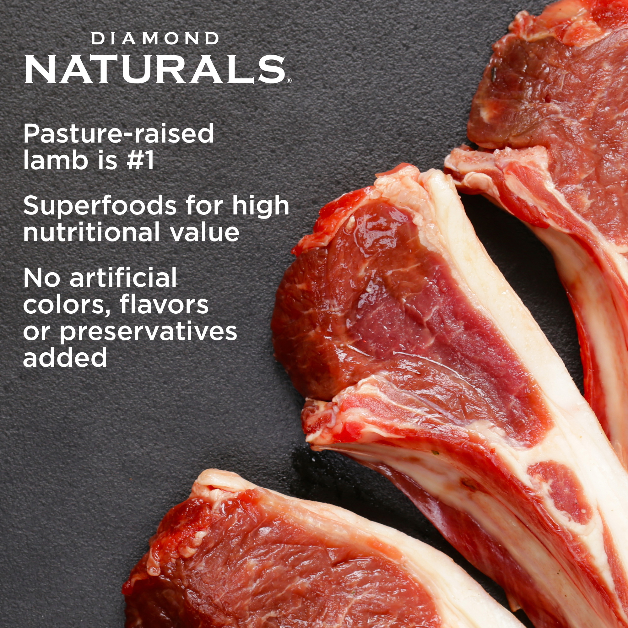 Diamond Naturals Dog Food, L, Puppy Breed, Lamb, Rice Flavor, 40 lb Net Content, Ingredients: Lamb, Lamb Meal, Whole Grain Brown Rice, Cracked Pearled Barley, Ground White Rice, Dried Yeast, Chicken Fat (Preserved with Mixed Tocopherols), Egg Product, Fish Meal, Tomato Pomace, Flaxseed, Natural Flavor, Salmon Oil (Source of DHA), Salt, Dl-Methionine, Potassium Chloride, Choline Chloride, Taurine, Dried Chicory Root, L-Carnitine, Kale, Chia Seed, Pumpkin, Blueberries, Oranges, Quinoa, Dried Kelp, Coconut, Spinach, Carrots, Papaya, Yucca Schidigera Extract, Dried Lactobacillus Plantarum Fermentation Product, Dried Bacillus Subtilis Fermentation Product, Dried Lactobacillus Acidophilus Fermentation Product, Dried Enterococcus Faecium Fermentation Product, Dried Bifidobacterium Animalis Fermentation Product, Vitamin E Supplement, Beta Carotene, Iron Proteinate, Zinc Proteinate, Copper Proteinate, Ferrous Sulfate, Zinc Sulfate, Copper Sulfate, Potassium Iodide, Thiamine Mononitrate, Manganese Proteinate, Manganous Oxide, Ascorbic Acid, Vitamin A Supplement, Biotin, Niacin, Calcium Pantothenate, Manganese Sulfate, Sodium Selenite, Pyridoxine Hydrochloride, Vitamin B12 Supplement, Riboflavin, Vitamin D Supplement, Folic Acid, Nutritional Information: 27% Crude Protein, 15% Crude Fat, 3% Crude Fiber, 10% Moisture, 0.05% DHA, 1.2% Calcium, 1% Phosphorus, 150 mg/kg Zinc, 0.35 mg/kg Selenium, 150 IU/kg Vitamin E, 0.12% Taurine, 300 mg/kg L-Carnitine, 0.3% Omega-3 FA, 2% Omega-6 FA, >80,000,000 CFU/lb Total Microorganisms