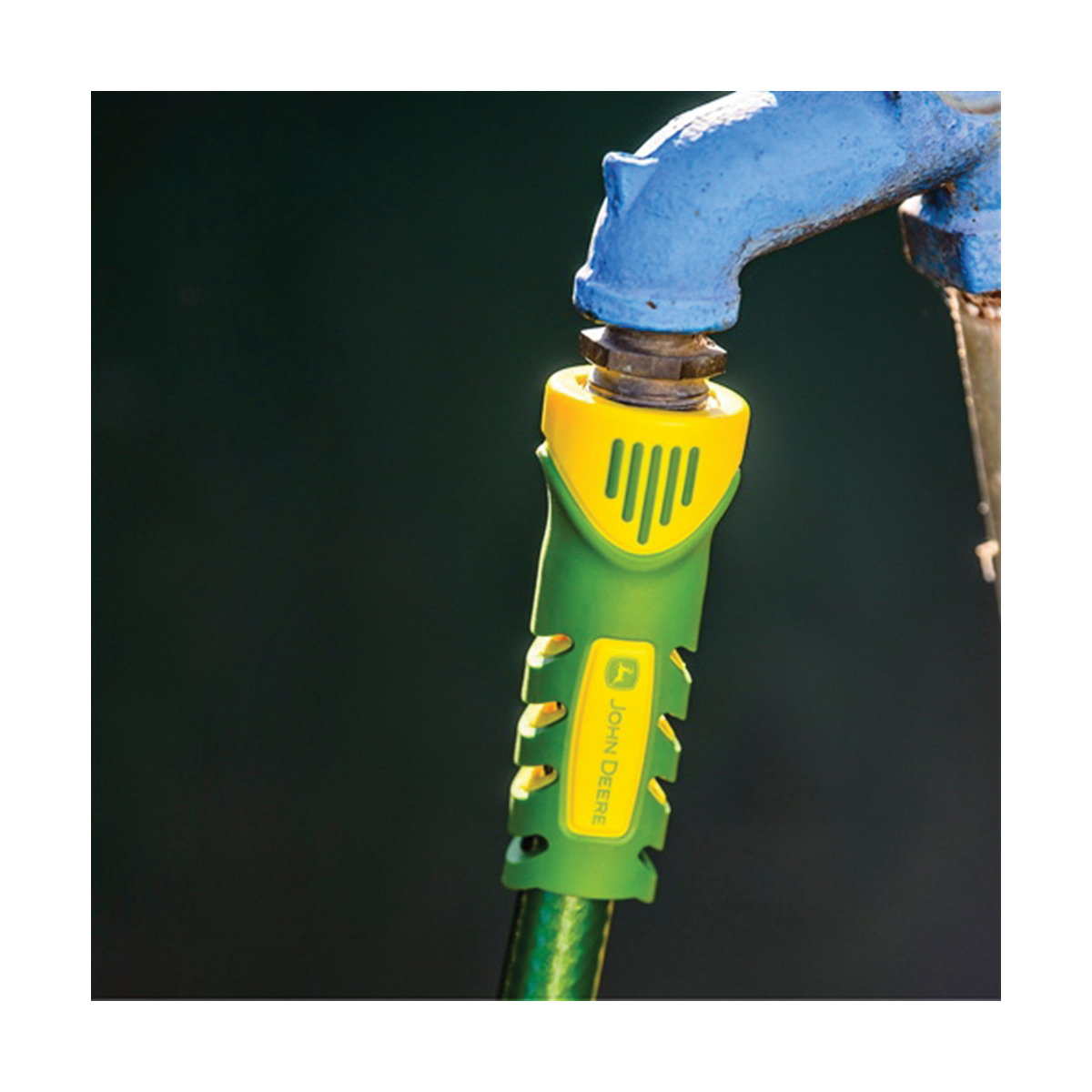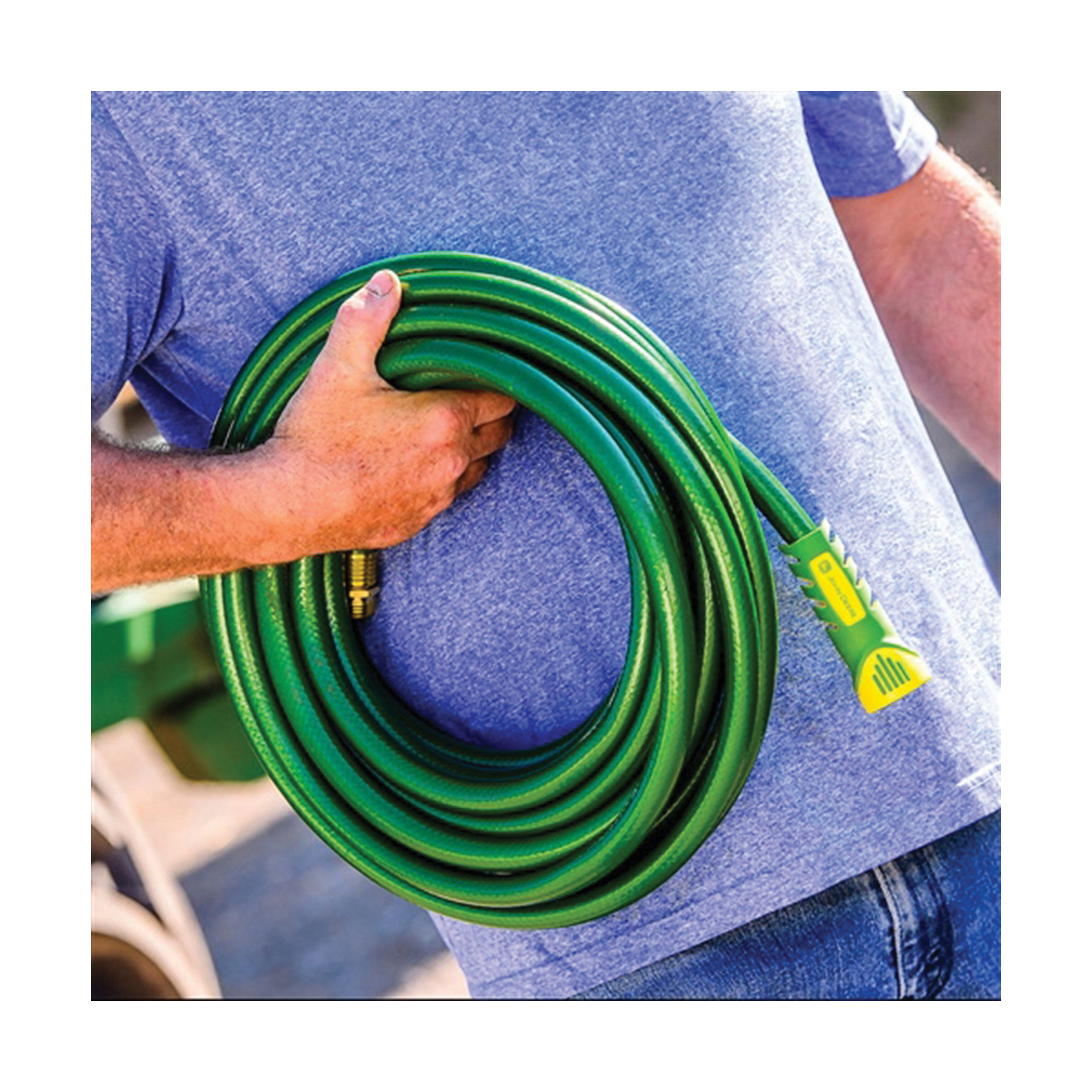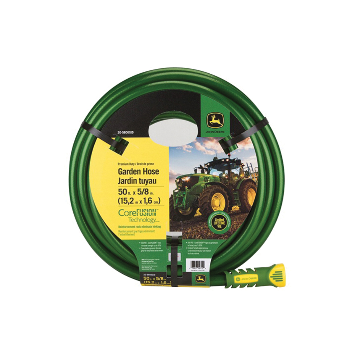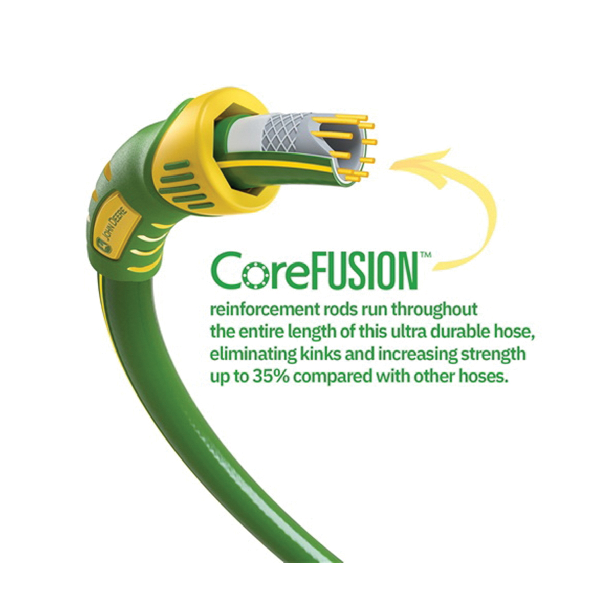 Made exclusively by Swan, the John Deere garden hose with CoreFUSION® technology represents the innovation and quality at the heart of John Deere, one of America's leading brands in lawn care and construction equipment. Designed in the iconic colors of the John Deere brand, the John Deere garden hose is one of the first garden hoses to feature Swan's new CoreFUSION® technology, a major advancement in garden hose functionality that makes a garden hose kink-free. CoreFUSION® technology uses Swan's patent-pending co-extrusion process to add strong rods of a unique compound throughout the entire length of a garden hose's interior wall to reinforce it. These proprietary rods then cause the garden hose to bend only so far in any direction, eliminating the kinks that cut-off water flow. These rods also increase the John Deere garden hose's strength up to 35% compared with other garden hoses. This significantly improves the ability of the John Deere garden hose to resist damage under tension and therefore makes it one of the longest lasting garden hoses on the market. This ultra durable garden hose also boasts a powerful 500 psi burst strength to meet the most demanding needs of gardeners, landscapers, serious DIYers and other related professionals. The John Deere water hose is also an ideal kink-free garden hose for the homeowner who needs the strength of a professional garden hose to water the lawn or to power-wash a home, vehicle or equipment.