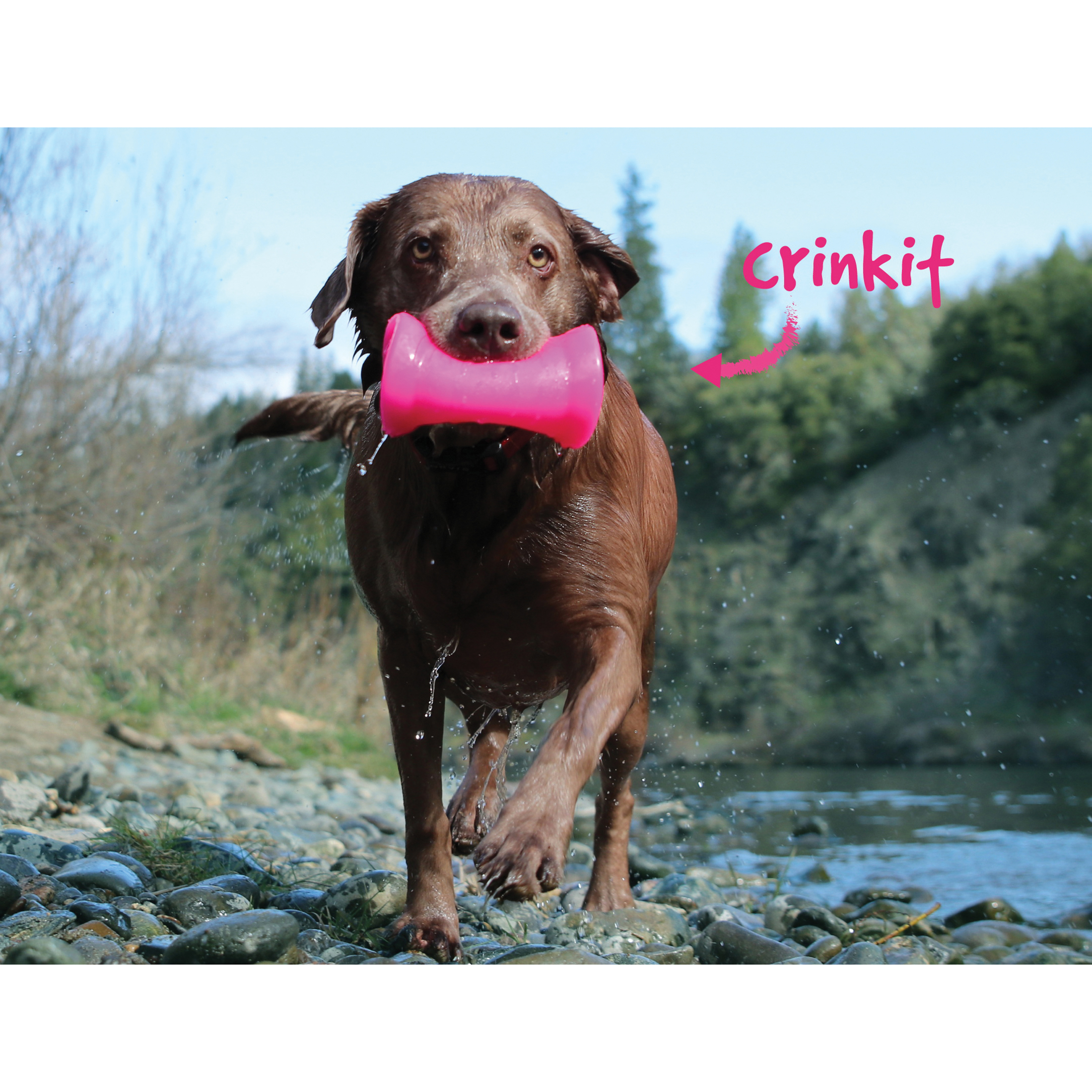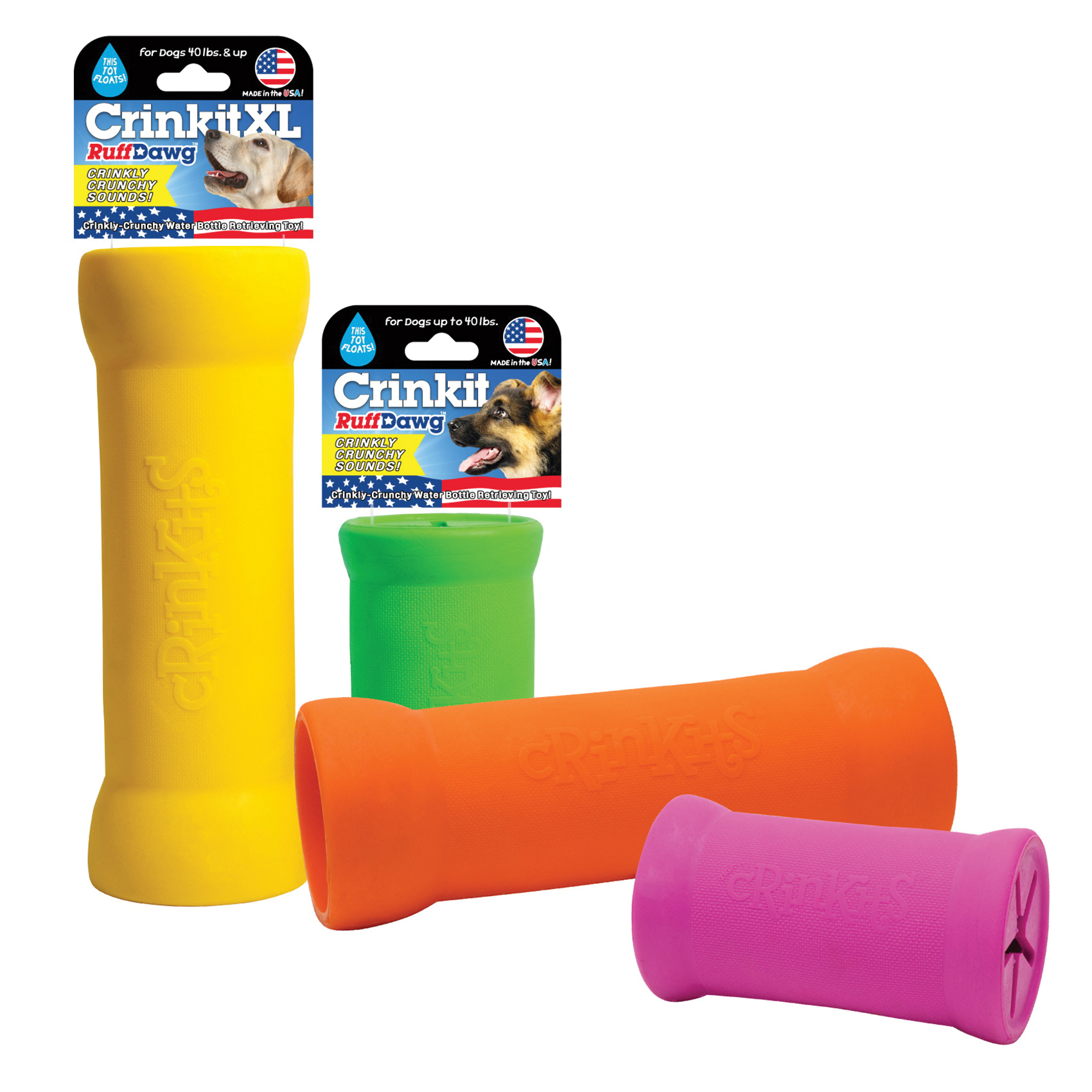 The crinkly crunchy sound and feel dogs love new crinkit noise making water bottle toy is made with a durable, solid, FDA Approved rubber shell encasing an empty water bottle. Dogs get all the long-lasting crunching they love without harming their teeth and gums. In assorted high visibility neon colors. Water bottle is replaceable and recyclable.