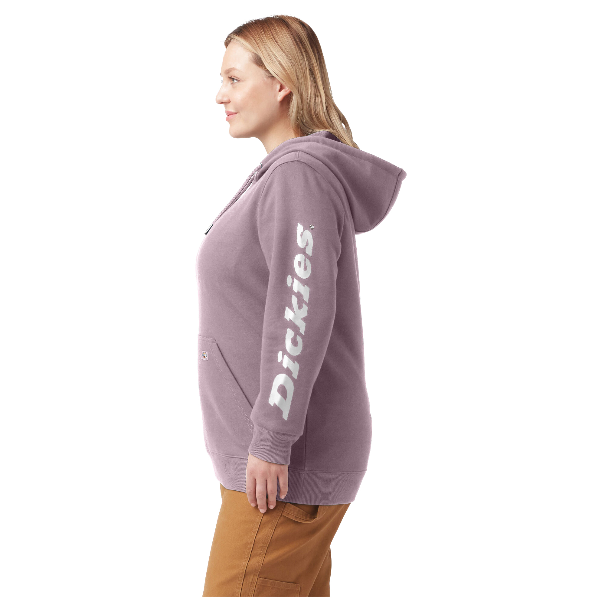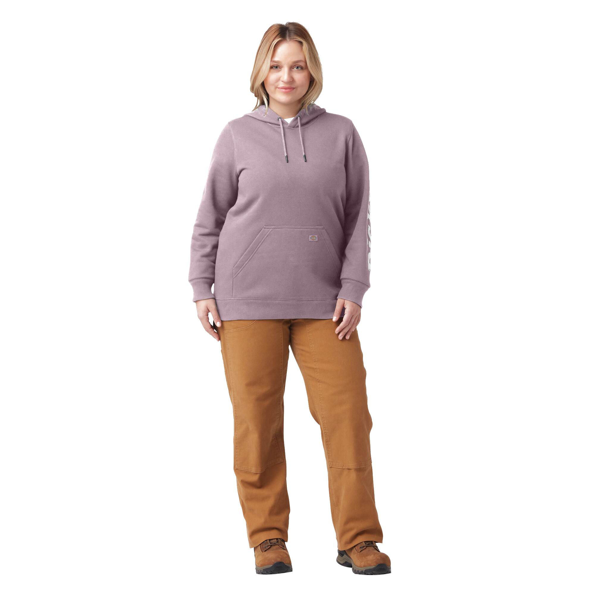 Dickies women's plus heavyweight wordmark fleece pullover is constructed from a soft fleece for a comfortable hand feel. Double-needle stitching provides added strength, while the durable water-repellent finish enables this hoodie to be put to work in wet conditions. Equipped with a crossover neckline, three-piece adjustable hood and rib-knit waist and cuffs, you'll be sure to keep the elements out while you perform in ultimate comfort. There is no shortage of layering potential with this hoodie, a true wardrobe staple that outlasts every season. The kangaroo pocket at front provides added utility to store small gear or to quickly warm your hands while on the go. Complete with a left sleeve Dickies graphic, there's no denying your devotion to protective and performance-driven workwear.