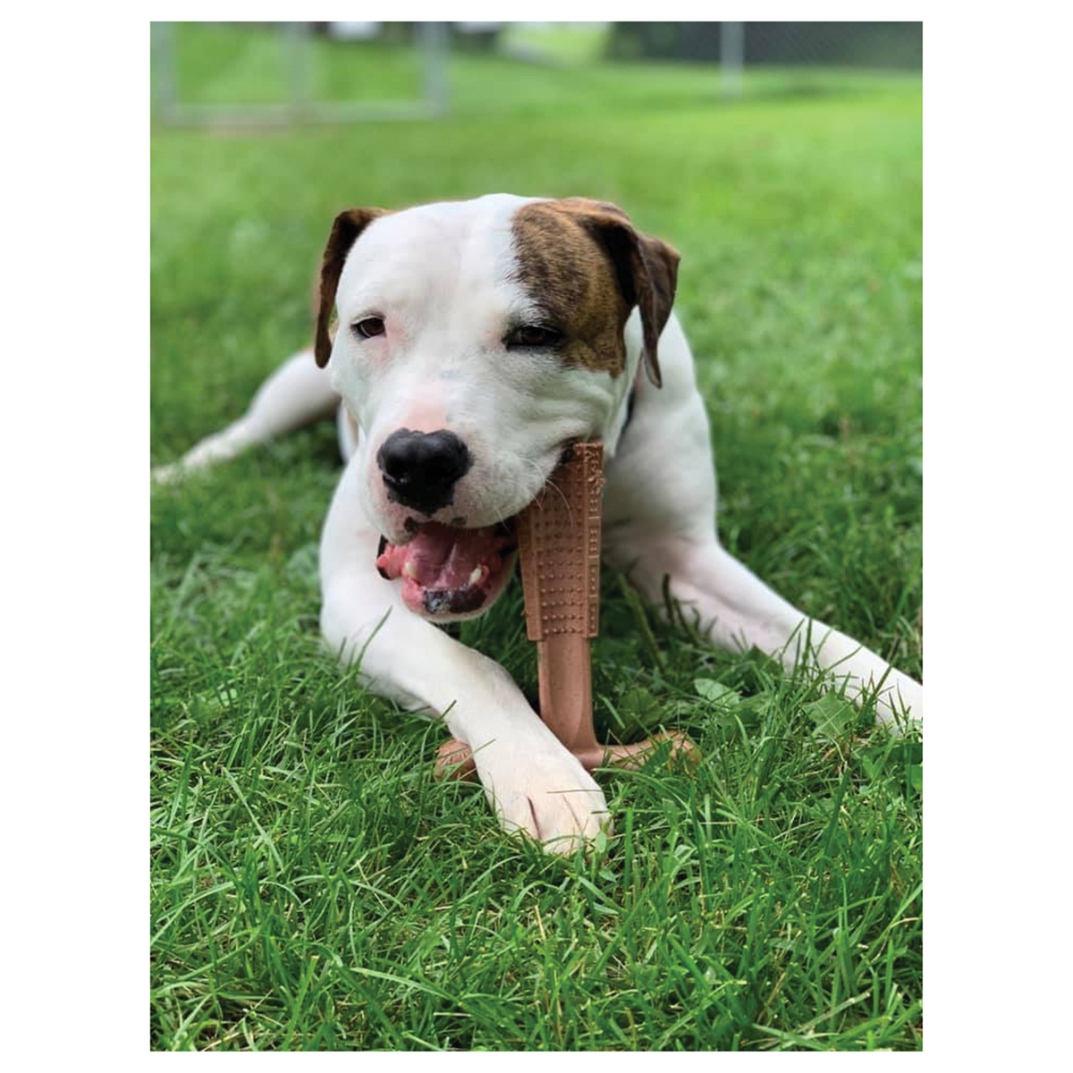 Made of strong bamboo fibers combined with nylon for a stronger, longer lasting chew. Raised nubs massage teeth and gums for a healthy mouth. Easy-to-grip shape so dogs can hold it steady.