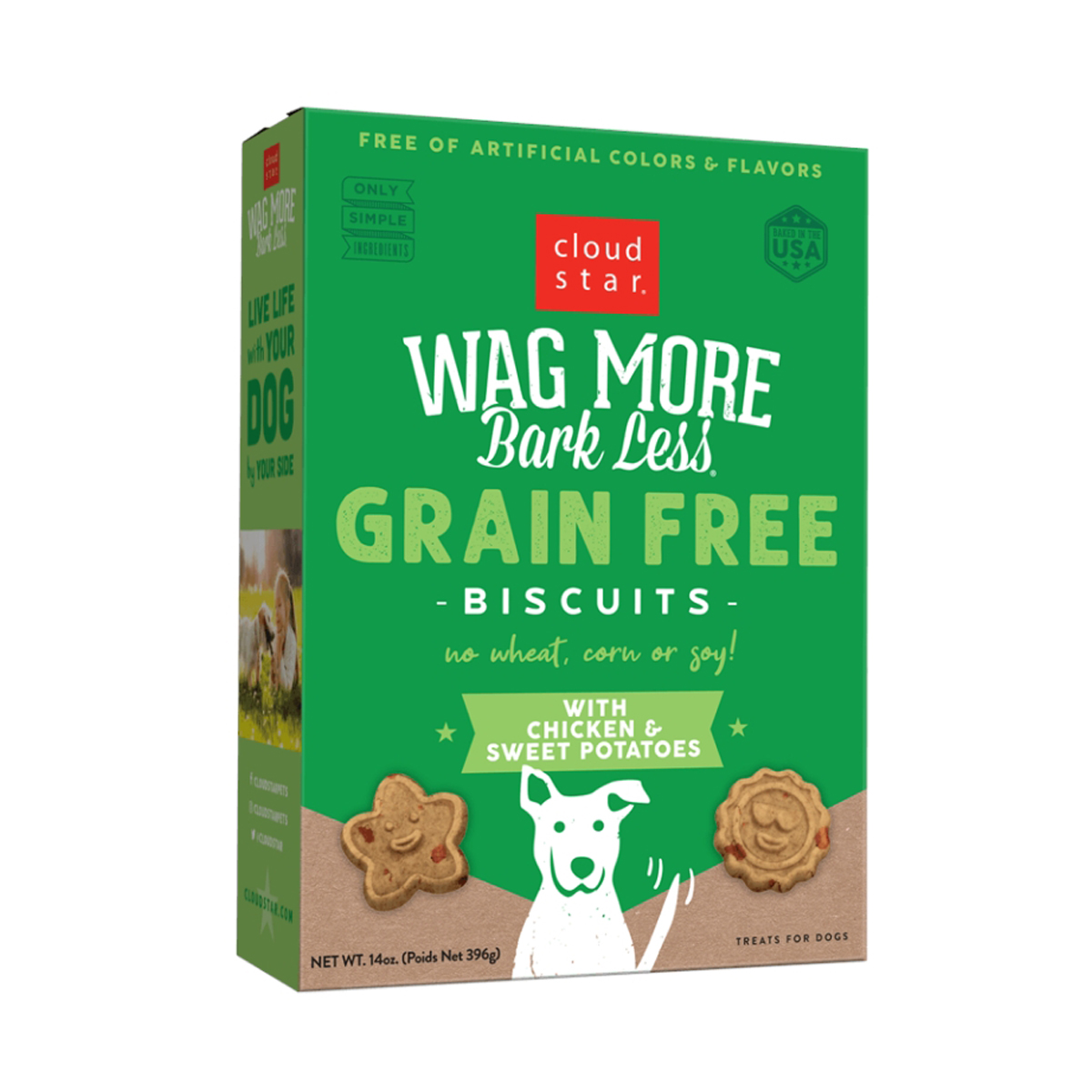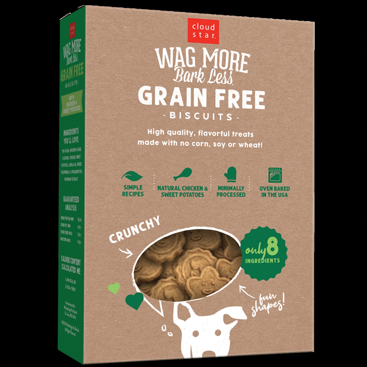 cloud star Wag More Bark Less Dog Biscuit, Crunchy Form, Chicken, Sweet Potatoes Flavor, 14 oz Net Content, Box Container, Special Diet: Corn-Free, Gluten-Free, Grain-Free, Soy-Free, Ingredients: Chickpea Flour, Chicken, Canola Oil, Mixed Tocopherols (preservative), Flaxseed, Pea Flour, Sweet Potatoes, Tapioca Starch, Nutritional Information: 15% Crude Protein (Min), 6% Crude Fat (Min), 5% Crude Fiber (Max), 11% Moisture (Max)