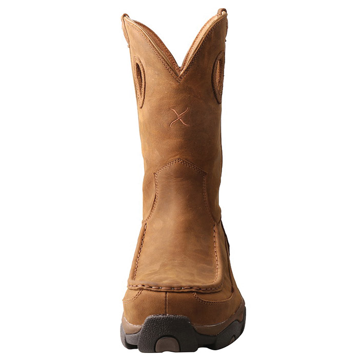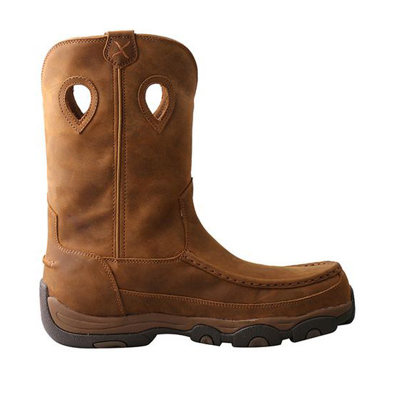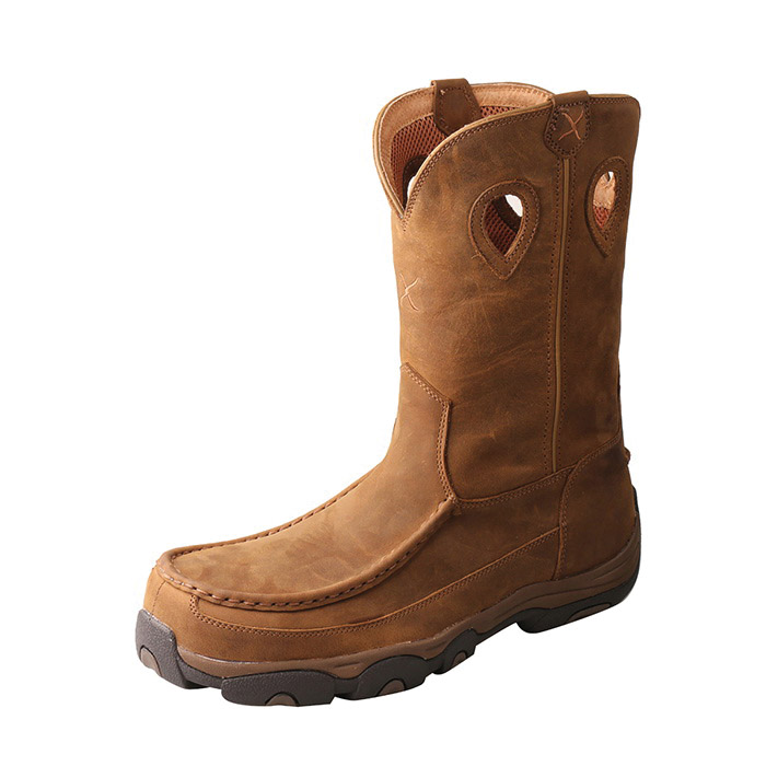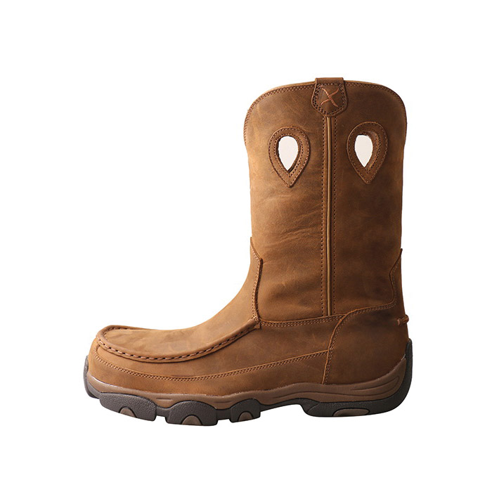 The men's 11 in pull-on hiker boots is handcrafted with premium full-grain leathers. The Twisted X® moulded footbed and three-quarter length composite insole provide all day cushion and support. The full length moulded EVA midsole provides a layer of shock absorption for the entire foot. This is paired up with a durable moulded rubber outsole for traction in challenging conditions. To improve footwear lifespan, this outsole has an integrated toe cap and heel kick. These features blend to produce a versatile boots that has increased functionality compared to other casual footwear.