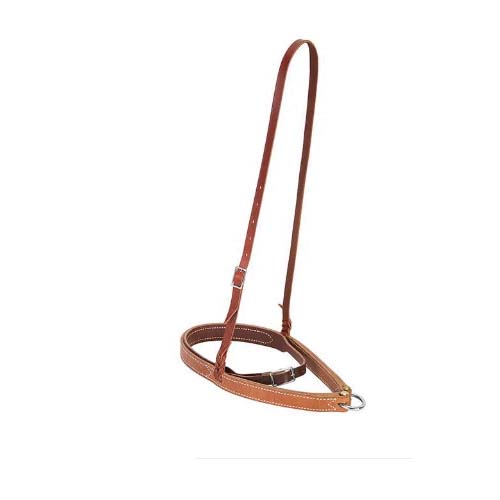 This noseband has a soft, supple burgundy latigo leather caveson attached to the inside of the nosepiece. A latigo leather 1/2 in crown strap attaches to the 1 in russet harness leather noseband with bleeding heart knots. Durable nickel-plated buckle.