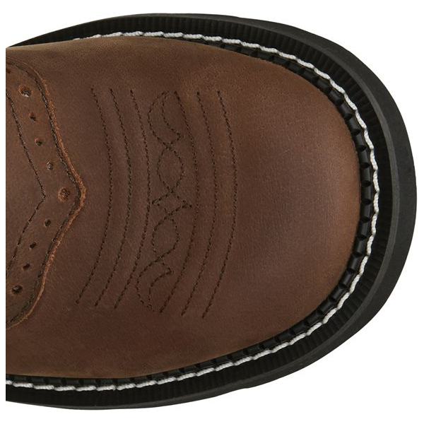 The 8 in tall Gemma aged bark Justin Gypsy™ women's cowboy boot features a chocolate brown leather exterior with a slightly vintage feel. The rustic brown provides a neutral backdrop to the hot pink and cream stitch pattern on the upper. The pastel pink seam on the quarter and trim provides an element of femininity and the diamond cut pull strap is a signature detail. Its round toe and unit heel provide an easy fit and the J-Flex Flexible Comfort System® insole with removable orthotic inserts add cushion and support in or out of the saddle.