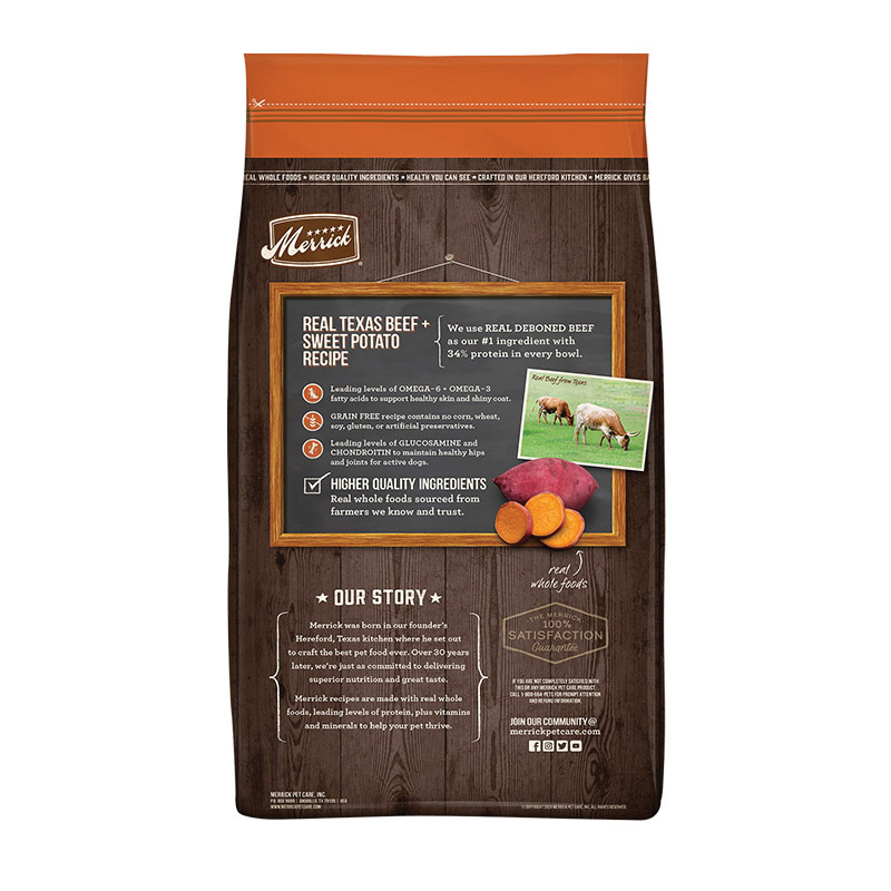 Merrick grain-free real Texas beef plus sweet potato recipe dry dog food provides balanced nutrition with real whole foods sourced from local farmers we know and trust. This natural, grain-free formula dog food is ideal for all breeds and sizes of dogs with a focus on naturally nutrient rich ingredients to support overall health.