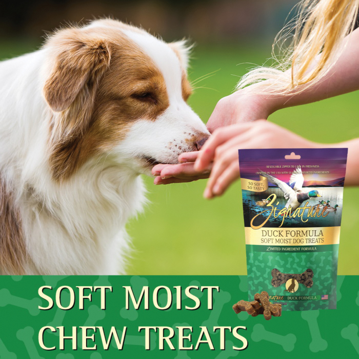 zignature® soft moist dog treats are formulated with the same limited ingredient philosophy as our dry and canned foods. Delivering a high-quality, delicious treat for your canine companion. By excluding ingredients your dogs do not need, we are able to bring you a treat that is simple yet so tasty. At zignature®, "We Have The Solution" for your dog's particular taste. To bring out the better in dogs, zignature® is committed to providing animal or fish protein as the first ingredient as protein is essential for a healthy diet. zignature® soft moist dog treats are made with animal or fish protein first, followed by a simple list of other wholesome ingredients.