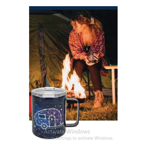 Drink your coffee or tea from Camco's Life is Better at the Campsite stainless steel mug to show your love of the campsite at home or outdoors. This ultra durable mug is made with 18/8 kitchen-grade stainless steel with an inner copper coating and includes a BPA-free slider closing lid. The mug's double walls vacuum insulate your beverage, keeping it hot or cold longer. The design features a unique RV constellation design on navy frost.