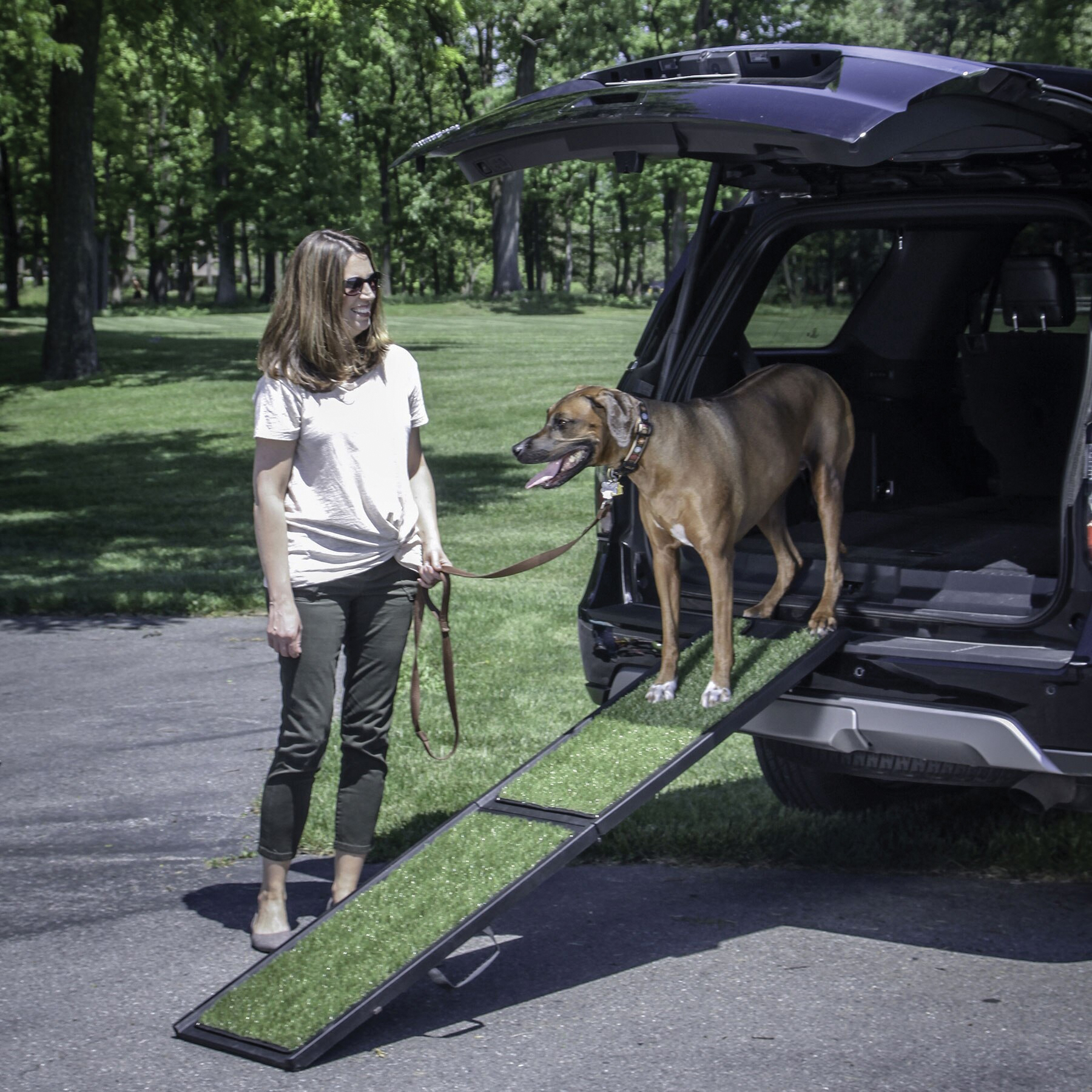As dog's age, getting in and out of the car can become difficult, painful and hard on your dogs body. Keep them going and provide the help they need with Gen7Pets® Natural-Step® ramp for vehicles. The natural step ramp features a poly grass surface that provides a much needed grip for your dog to get up and down the ramp easily. Designed with your pet's safety in mind, the natural step ramp has durable rubber grippers on both ends of the ramp that keeps it secure and in place while in use. The regular sized ramp features a safety tether latch that attaches to your cargo area's anchor to provide extra security while the ramp is in use. The mini sized ramp does not feature a safety tether. When done, fold the ramp in half and the automatic locking clip keeps it from opening accidentally. A convenient rubber grip handle and the lightweight design make it easy-to-store in your cargo area or under the back seat of your car.