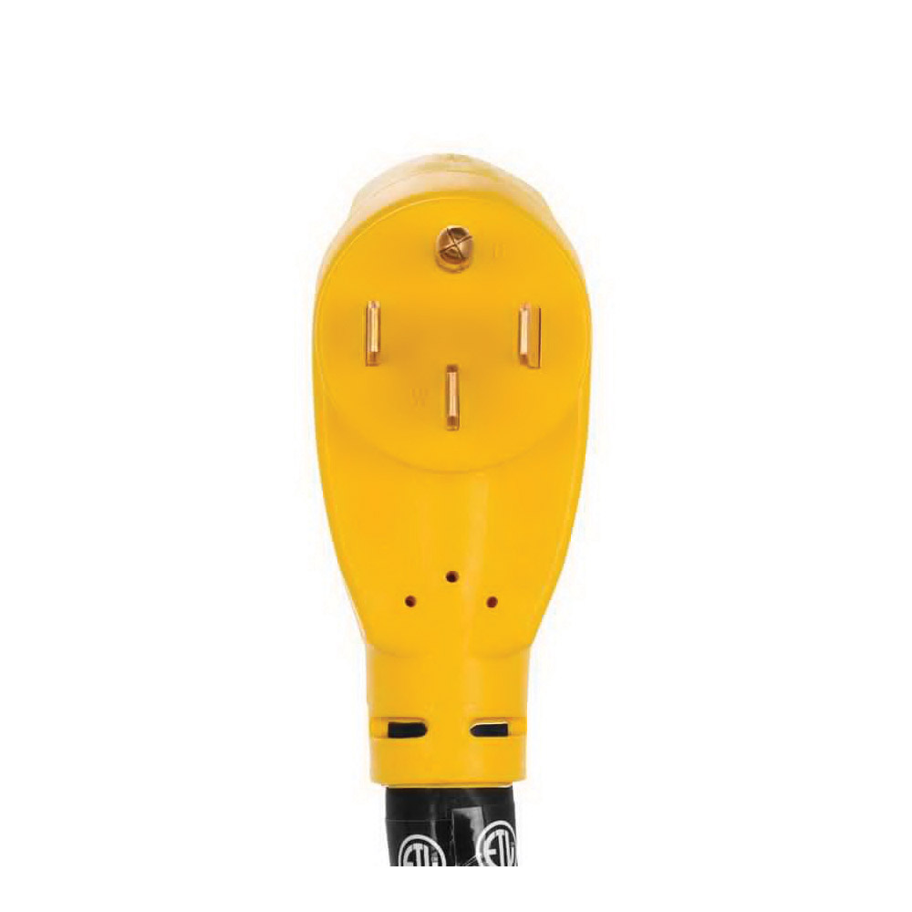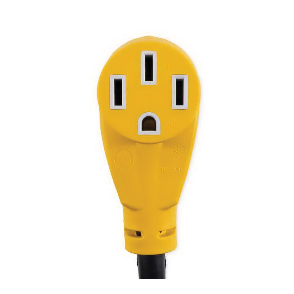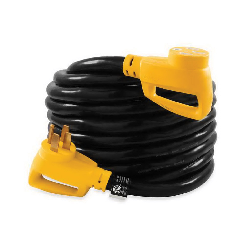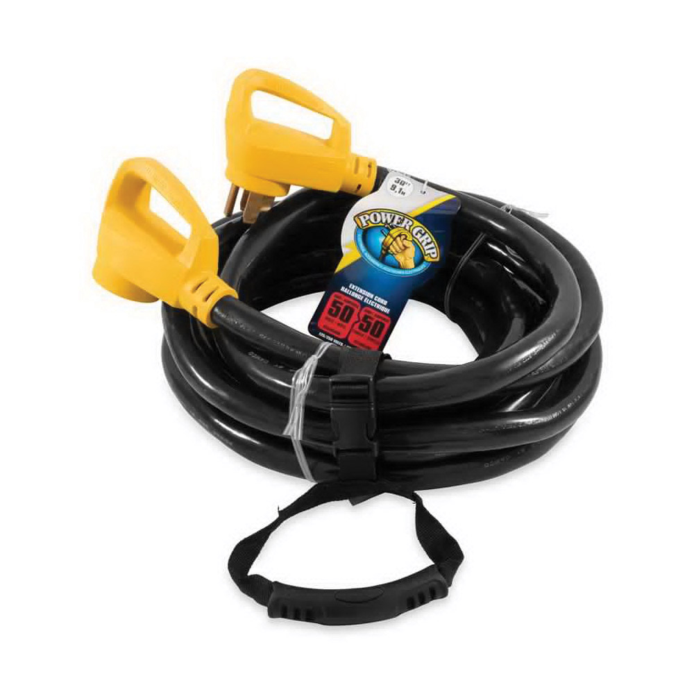 Camco 30 ft RV extension cord with handle is a 50 A cord with handles. It features the patented power grip handles for ease of use. This cord includes a convenient carrying strap.