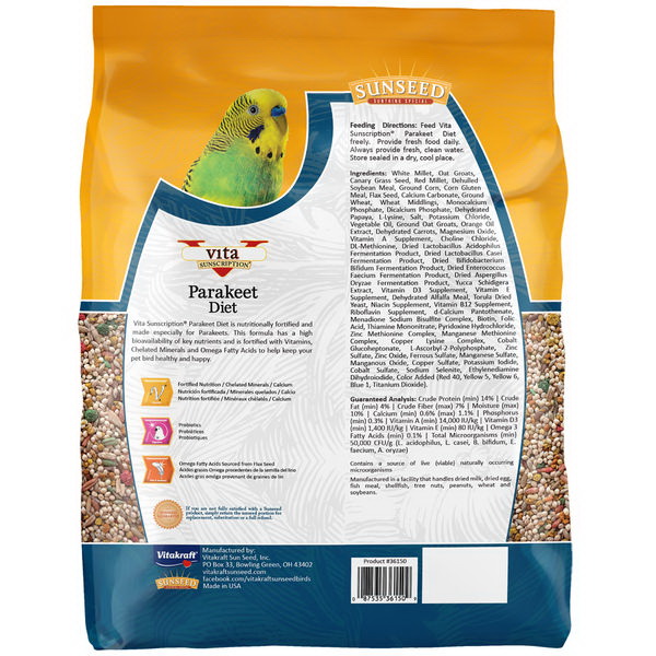 Delicious foraging diet fortified with vitamins and nutrients that support digestive and skin and feather health. Vita Subscription® Parakeet diet is formulated to meet the specific nutritional needs of companion parakeets. Wholesome ingredients such as white millet, oat groats, red millet and corn are blended together and fortified with vitamins and nutrients to provide extra support for digestive, skin and feather health. With Vita Subscription, pet parents can rest easy knowing their parakeet is getting all the vitamins, chelated minerals, calcium, probiotics and omega fatty acids it needs to be happy, healthy and strong.