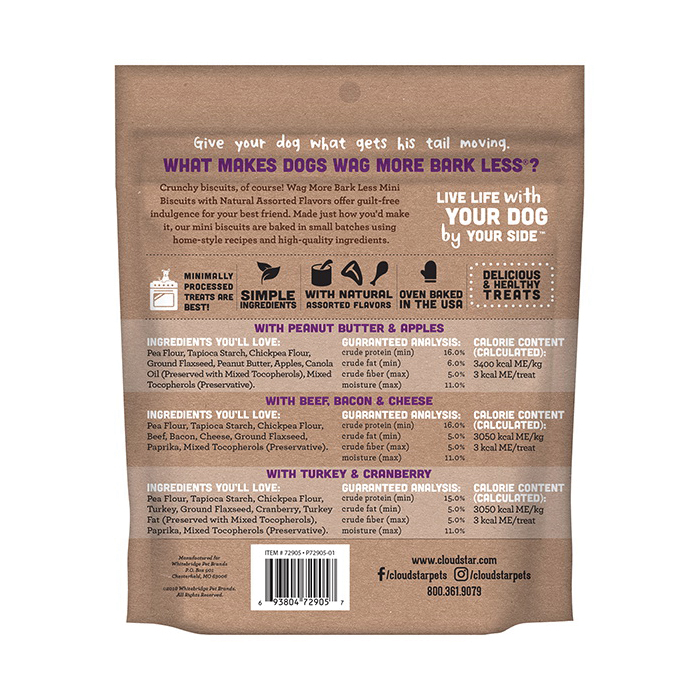 cloud star Wag More Bark Less Dog Biscuit, Size: Mini, Assorted Flavor, 14 oz Net Content, Special Diet: Gluten-Free, Grain-Free, Ingredients: Beef, Bacon, Cheese, Peanut Butter, Apple, Turkey, Cranberry, Tapioca Starch, Chickpea Flour, Dried Cheddar Cheese, Ground Flaxseed, Paprika Mixed Tocopherols (Preservative), Ground Flaxseed, Canola Oil (Preserved with Mixed Tocopherols), Turkey Fat (Preserved with Mixed Tocopherols), Nutritional Information: 16% Crude Protein, 5% Crude Fat, 5% Crude Fiber, 11% Moisture (Beef, Bacon and Cheese), 16% Crude Protein, 5% Crude Fat, 6% Crude Fiber, 11% Moisture (Peanut Butter and Apples), 15% Crude Protein, 5% Crude Fat, 5% Crude Fiber, 11% Moisture (Turkey and Cranberry)