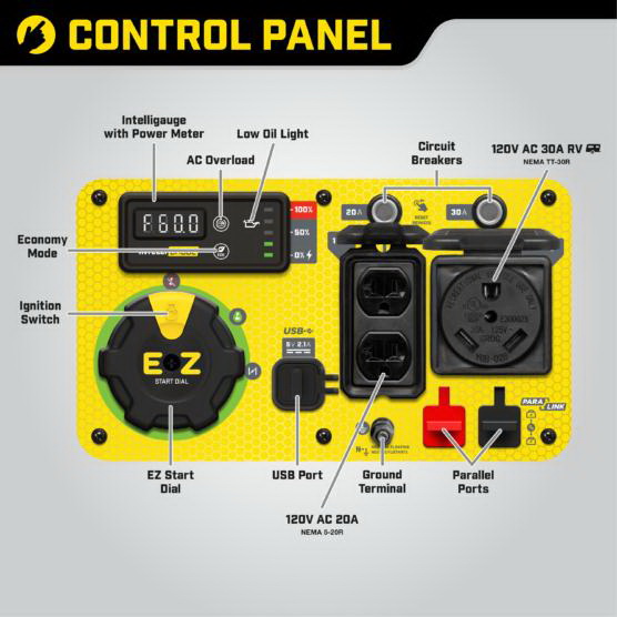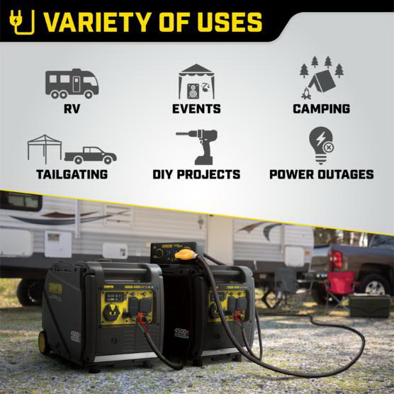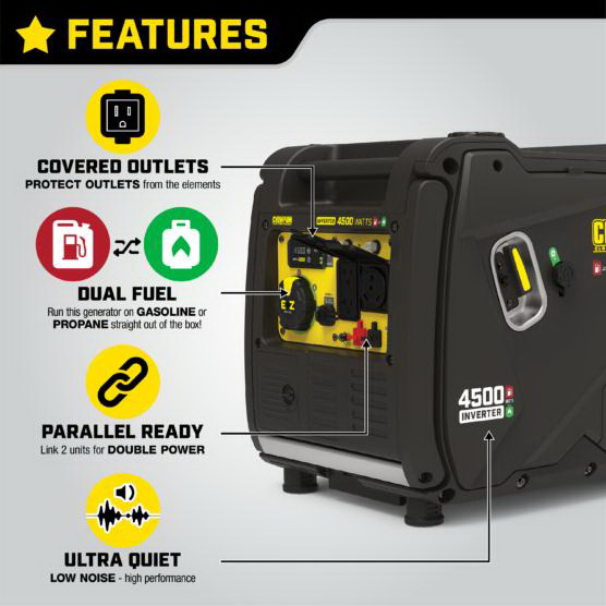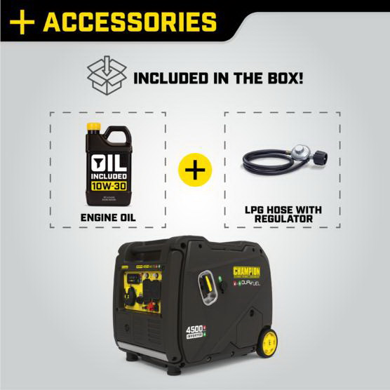 The Champion Power Equipment 4500 W Inverter Generator is ultra-quiet and ideal for camping, tailgating, powering items around the RV or providing backup for your essentials. Champion's EZ Start dial makes getting started quick and easy. Featuring cold start technology, extended run time and an easy to read fuel gauge. With a 0.5 qt oil capacity (included 10W-30) and a low oil shut-off sensor, this inverter operates at an ultra-quiet 61 dBA from 23 ft, which is about as loud as normal speech. The no tool access panel and oil drain tube allow for easy maintenance. Confidently connect your sensitive electronics since this inverter produces clean power (less than 3% THD). Operate your dual-fuel generator right out of the box on gasoline or propane and easily switch fuels with the EZ Start dial. When the 2.3 gal tank of gasoline is full, the 212 cc Champion engine produces 4500 W starting and 3500 W running and will run for up to 14 hr at 25% load. When using a 20 lb propane tank, it produces 4500 W starting and 3150 W running and will run for up to 21 hr at 25% load. The covered outlets in this RV ready inverter include a 120 V 30 A RV (TT-30R), two 120 V 20 A household outlets (5-20R) and dual USB outlets (5 VDC, 2.1 A). The optional parallel kit, with included standard 50 A RV outlet, allows you to increase output by connecting up to two 3500 W or higher inverters. The never flat tires and fold-down handle make transport a cinch.