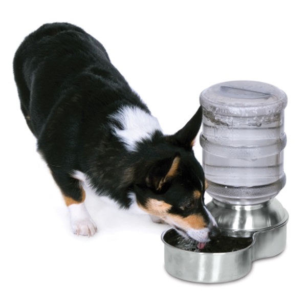 The Petmate stainless steel Replendish waterer is perfect for pet parents that want to provide a constant flow of fresh water throughout the day for their pet even when they're not home. The vet-recommended stainless steel base resists harmful bacteria growth and can be safely put into the dishwasher for easy cleaning and sanitizing at high-temperatures. The waterer features recessed areas for easy lifting and water filling and non-skid rubber feet to keep spills and movement to a minimum. A decorative smoke colored one-gallon bottle complements the stainless steel base and has a wide mouth to make cleaning easy. Made in the USA.