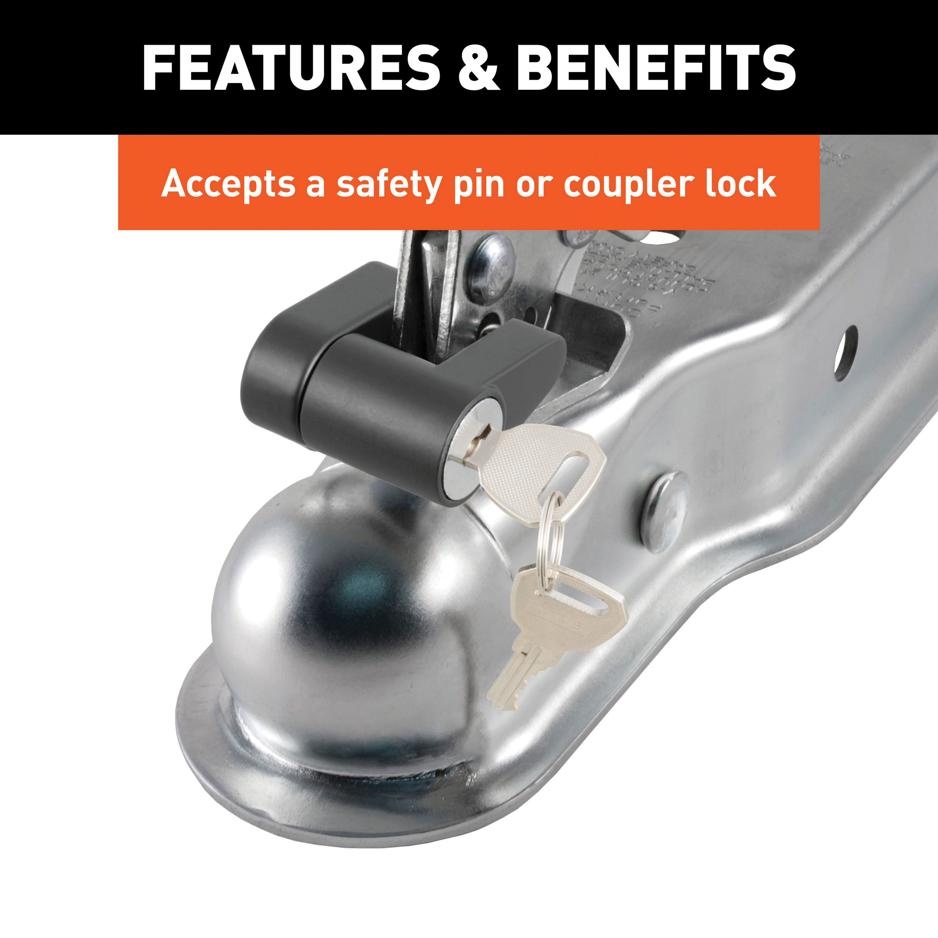 If you are replacing a broken coupler on your trailer or installing a new one on a trailer you are building, Curt has dependable couplers you can trust to keep your tow load latched on tightly. Selecting the right trailer hitch, ball mount and trailer ball to manage the weight of your trailer is not the only important aspect of towing, you also need a trailer that can stand up to the road ahead. That means equipping it with a coupler that is built to go the distance. Curt straight-tongue couplers, featuring our posi-lock latch, are the most common type of trailer coupler. With a mounting channel designed to fit onto a straight trailer tongue, the posi-lock coupler is easy to install. It is made from hardy steel construction and has a durable zinc finish to protect from corrosion, wear and tear. The lockable latch mechanism on Curt posi-lock couplers is easy to operate and adjusts by tightening or loosening a simple bolt. This Curt straight-tongue coupler features a gross trailer weight capacity of 3500 lb and a tongue weight capacity of 500 lb. It has a 2 in channel and fits a 2-1/2 in Dia trailer ball. All Curt couplers include a limited lifetime warranty and feature a lockable latch to give you peace of mind.