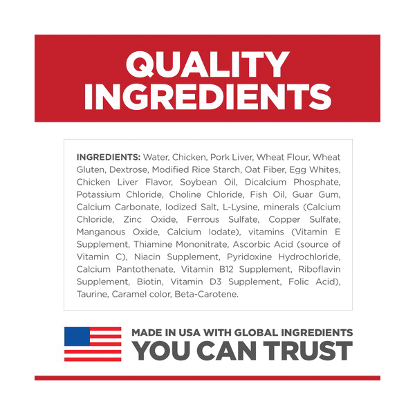 Ingredients | : | Ascorbic Acid (Source of Vitamin C), Beta-Carotene, Biotin, Chicken Liver Flavor, Choline Chloride, Calcium Carbonate, Calcium Pantothenate, Dextrose, Caramel Color, Copper Sulfate, Chicken, Dicalcium Phosphate, Egg Whites, Folic Acid, Fish Oil, Guar Gum, Iodized Salt, L Lysine, Minerals (Calcium Chloride, Zinc Oxide, Ferrous Sulfate, Manganous Oxide, Calcium Iodate), Modified Rice Starch, Niacin Supplement, Oat Fiber, Potassium Chloride, Pork Liver, Pyridoxine Hydrochloride, Riboflavin Supplement, Soybean Oil, Taurine, Vitamin B12 Supplement, Vitamin D3 Supplement, Vitamins (Vitamin E Supplement, Thiamine Mononitrate), Water, Wheat Flour, Wheat Gluten |