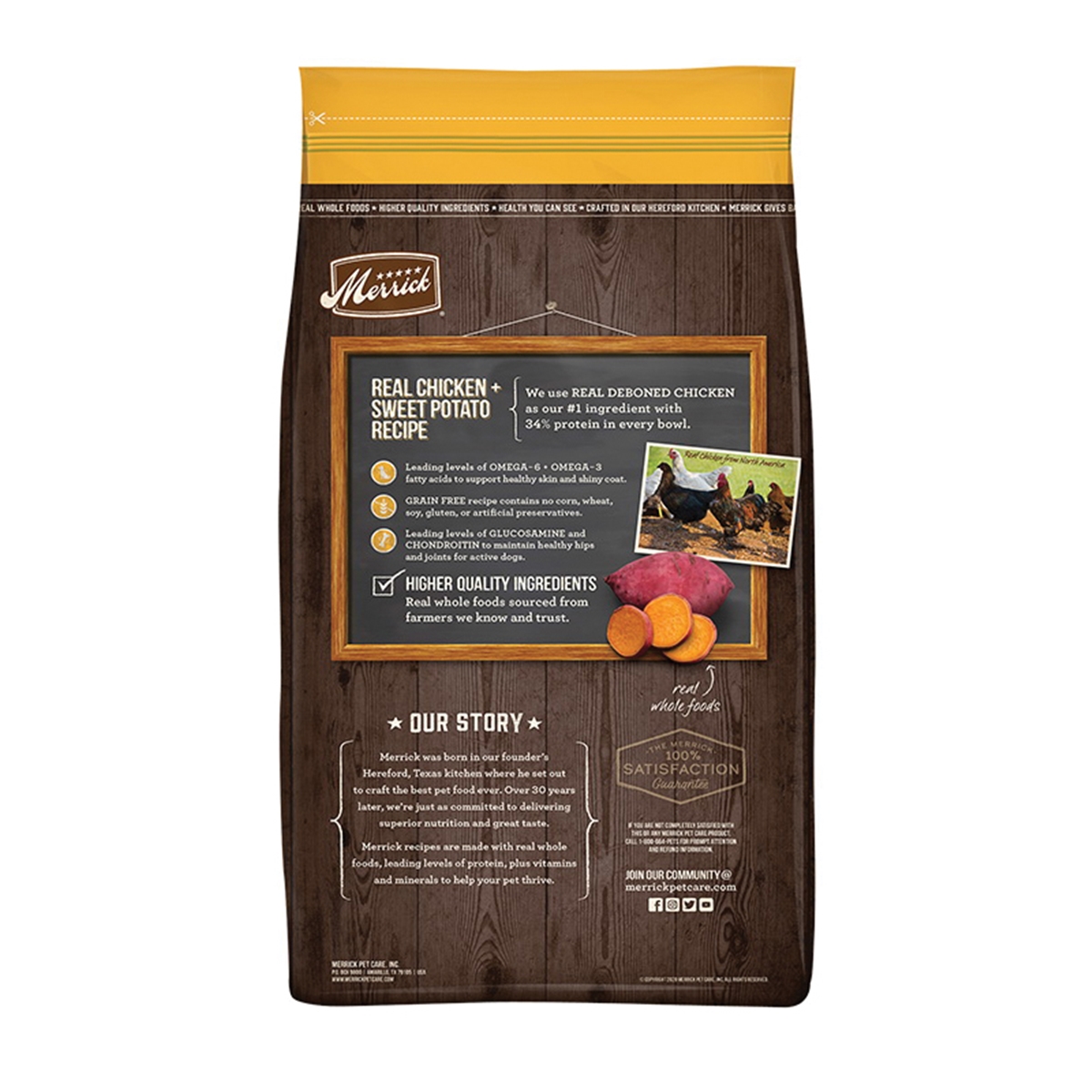 Merrick grain-free real chicken and sweet potato recipe dry dog food provides balanced nutrition with real whole foods sourced from local farmers we know and trust. This natural, grain-free formula dog food is ideal for all breeds and sizes of dogs with a focus on naturally nutrient rich ingredients to support overall health.