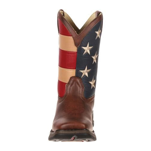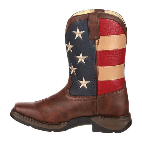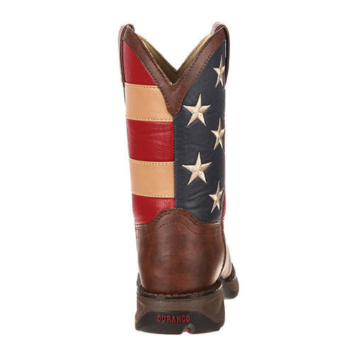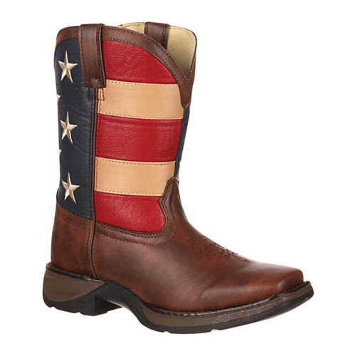 To make this Lil' Durango® kid's boot as adorable as it could be, the upper of this 8 in western was made with brown synthetic leather and an exuberant-looking flag shaft. Selecting a children's boot with man made materials is a fantastically wise decision, it looks and feels like the real thing, but your child will be able to wear these boots here, there and everywhere and you won't be concerned about the fabric getting damaged. Plus, it makes cleaning these kid's boots such an easy process. Your child will love the fact that these boots have the same features that are commonly found on an adult's Western. These Lil' Durango® boots have a dipped topline and pull-tabs, these are great features because it allows your child to get these boots On/Off without any difficulty. These western boots were made with a traditional looking and comfortable square toe. They also have a decorative toe bug stitch on the foot and a double-row of welt stitching that enhances the footwear's durability. There is a mesh lining within the interior of this kid's western, it is an extremely soft material that will keep these boots from chafing their legs. There is also a cushion flex insole, this feature provides an abundance of cushioning that will allow them to walk comfortably throughout the day. A tempered steel shank has been built-into this western boot, it allows your child to walk steadily and it supplies outstanding arch support. On the bottom, there is a Lil' Durango® outsole and a 1-1/8 in rocker heel. If you are looking for incredibly stylish yet comfortable footwear for your child, these 8 in Lil' Durango® kid's western boots are great.