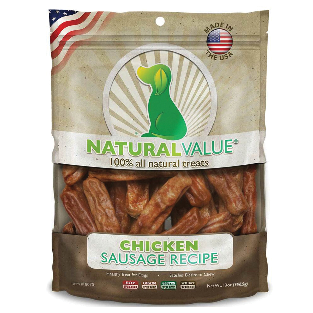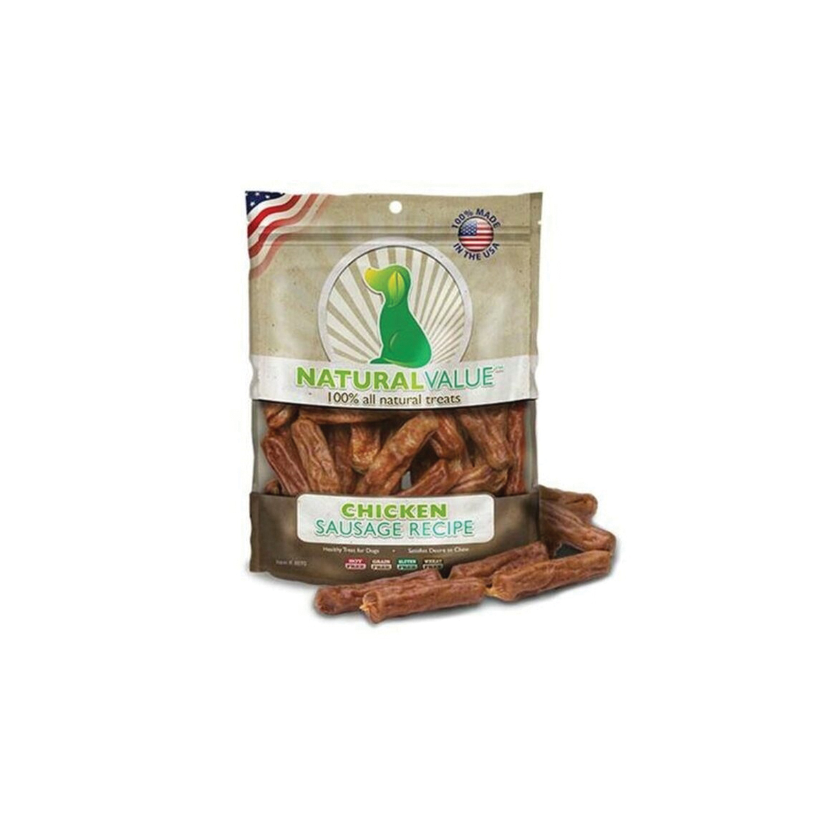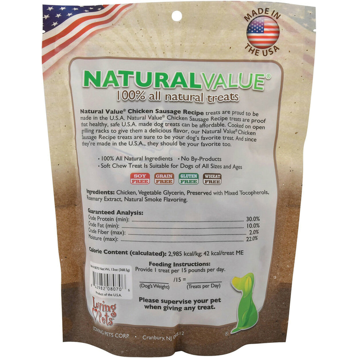 When you see all that Natural Value® soft chicken snacks for dogs have to offer, you'll want to fill your cart with these affordable, USA-made dog treats. Natural Value® soft-chew chicken sausages from Loving Pets are cooked to reduce fat and increase the flavor and they are free of grain, gluten, soy, corn, wheat, by-products and preservatives. Made with only the finest ingredients, you can be sure these Natural Value® grain-free chicken sausage treats are ideal for dogs of any size or age.