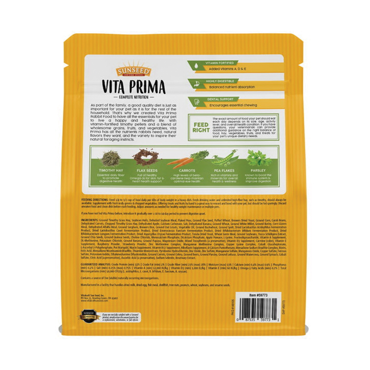 Timothy-based complete nutrition and foraging enrichment for rabbits. As part of the family, a good quality diet is just as important for your pet as it is for the rest of the household. That's why we created vita prima rabbit food to have all the essentials for your pet to live a happy and healthy life. With vitamin-fortified timothy pellets and a blend of wholesome grains, fruits and vegetables, vita prima has all the nutrients rabbits need, natural flavors they want and the variety to inspire their natural foraging instincts.