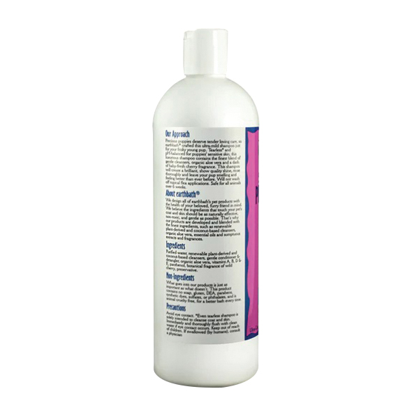 Precious puppies deserve tender loving care, so Earthbath® crafted this ultra-mild shampoo just for your frisky young pup. Tearless and PH-balanced for puppie's sensitive skin, this luxurious shampoo contains the finest blend of gentle cleansers, organic aloe vera and a dash of baby-fresh cherry fragrance. This shampoo will create a brilliant, show quality shine, rinse thoroughly and leave your pup smelling and feeling better than ever before. Will not wash off topical flea applications. Safe for all animals over six weeks.