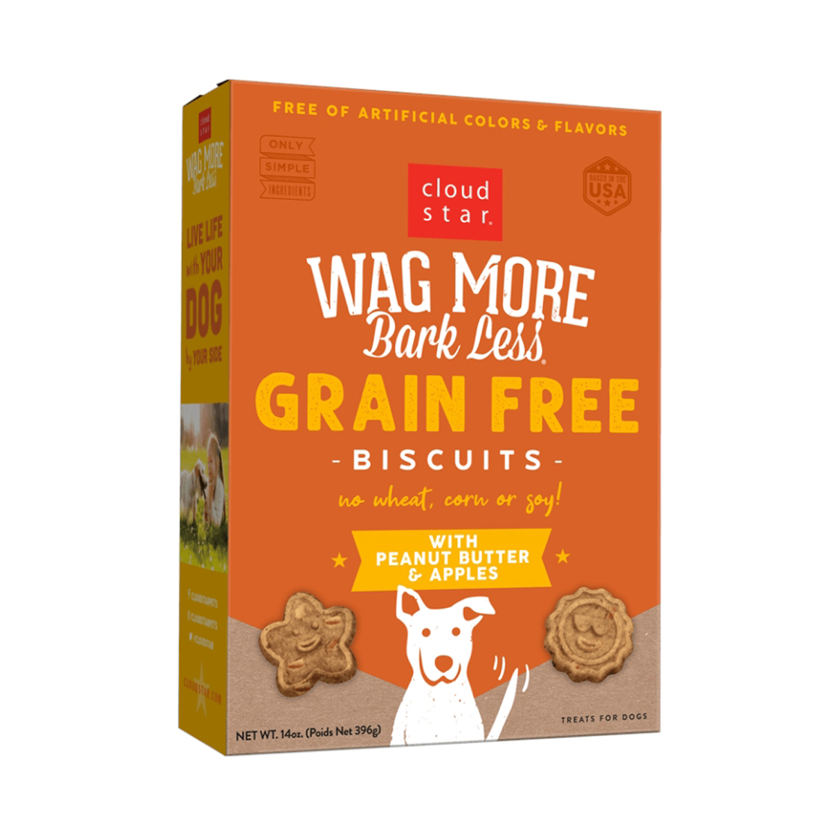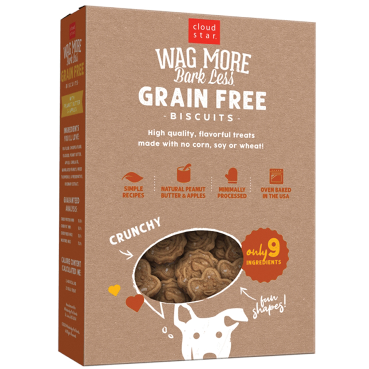 cloud star Wag More Bark Less Dog Biscuit, Crunchy Form, Apple, Peanut Butter Flavor, 14 oz Net Content, Box Container, Special Diet: Corn-Free, Gluten-Free, Grain-Free, Soy-Free, Ingredients: Apples, Chickpea Flour, Canola Oil, Flaxseed, Granulated Peanuts, Mixed Tocopherols (preservative), Pea Flour, Peanut Butter, Tapioca Starch, Nutritional Information: 16% Crude Protein (Min), 6% Crude Fat (Min), 5% Crude Fiber (Max), 11% Moisture (Max)