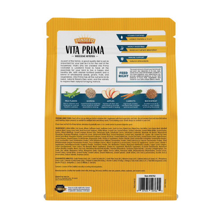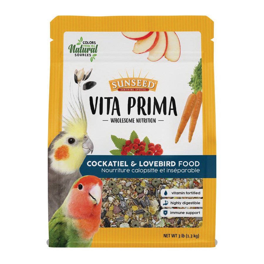 Nutritious seed, grain, and vegetable diet for cockatiels and lovebirds. As part of the family, a good quality diet is just as important for your pet as it is for the rest of the household. That's why we created Vita Prima Cockatiel and Lovebird Food to have all the essentials for your bird to live a happy and healthy life. With vitamin fortified pellets and a blend of wholesome seeds, grains, fruits, and vegetables, Vita Prima has all the nutrients birds need, natural flavors they want and the variety to inspire their natural foraging instincts.