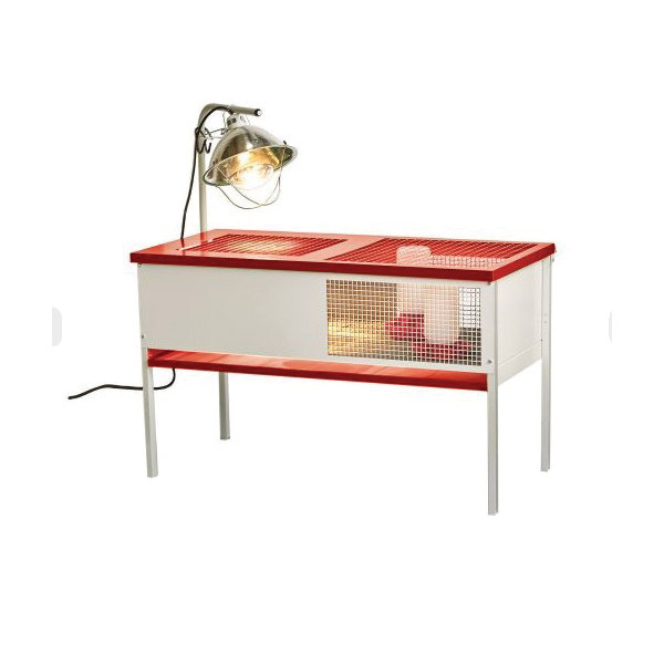 A safe observatory for brooding baby chicks up to four or five weeks old. Sturdy metal arm holds a brooder lamp (sold separately) over one side of the brooder. Chicks can move between the section of the brooder with solid metal walls and the section with wire grid walls to warm up or cool down as needed. Wire mesh floor has openings 5/16 in apart which are just right for small chick feet and the dropping pan should be placed inside the brooder covering the mesh for the chick's first couple of weeks. Once the chicks are larger, the dropping pan slides in and out under the wire mesh floor for easy removal and cleaning. Easily assembled using a flathead screwdriver and the included hardware.