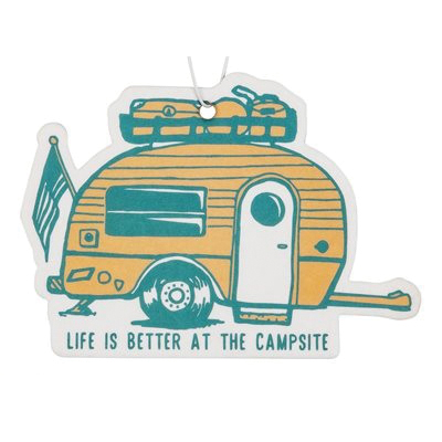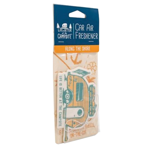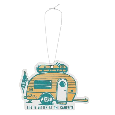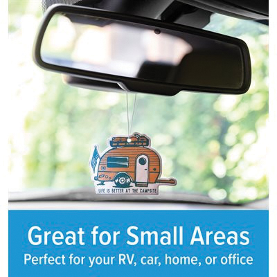 The life is better at the campsite air freshener provides a fresh, long-lasting, clean scent. It is ideal for small areas in your RV, car, home or office. An elastic tie cord allows it to be easily hung virtually anywhere. The air freshener features a retro RV design. Fragrance: Along the shore.