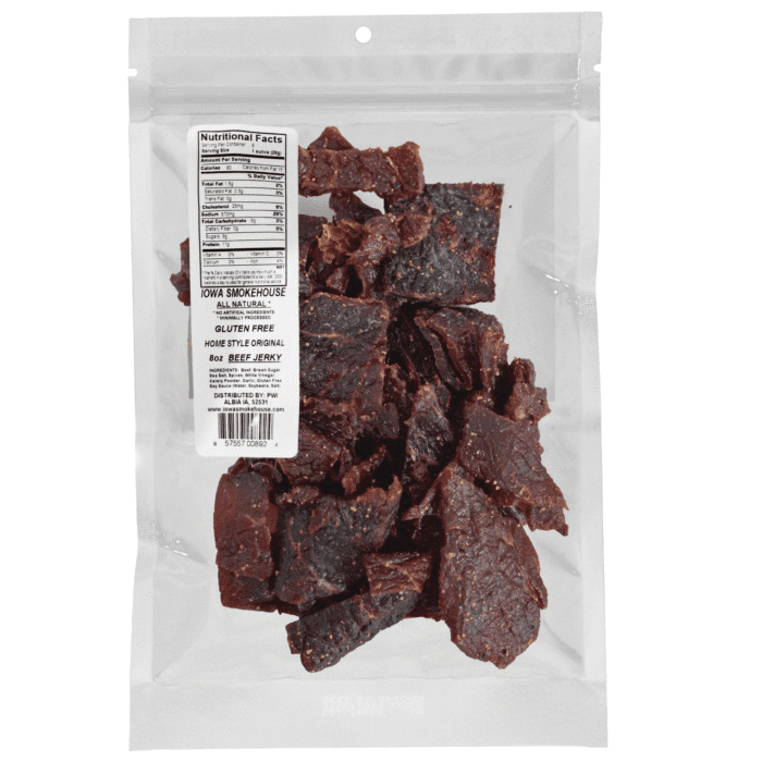 Iowa Smokehouse Beef Jerky, 8 oz Net Content, Nutritional Information: 90 Calories, 1.5 g Total Fat, 0.5 g Saturated Fat, 25 mg Cholesterol, 650 mg Sodium, 3 g Total Carbohydrates, 15 g Protein, Ingredients: Beef, Corn Syrup Solids, Beef Broth, Sea Salt, Yeast Extracts, White Vinegar, Pepper, Celery Powder, Garlic, Gluten Free Soy Sauce (Water, Soybeans, Salt), 8 Servings