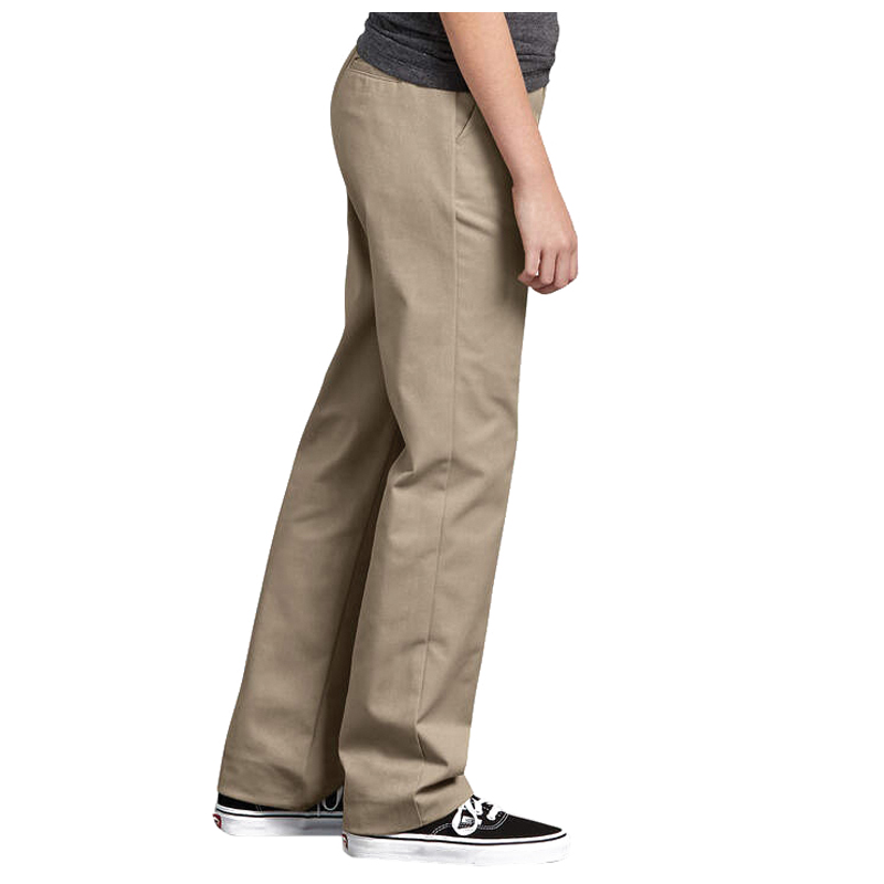 Not only do these Dickies FLEX slim fit straight leg flat front pant look stylish, they stay that way throughout the school day with wrinkle-resistant and stain release technologies. The mechanical stretch twill lets her do-anything from sitting through class to running through the playground at recess. And talk about comfort the mechanical stretch twill provides a long-lasting and durable pant you'll be able to keep longer than a regular all cotton pair. Also, added to the comfort is the FlexWaist® adjustable waistband that lets her fine-tune her fit as she grows.