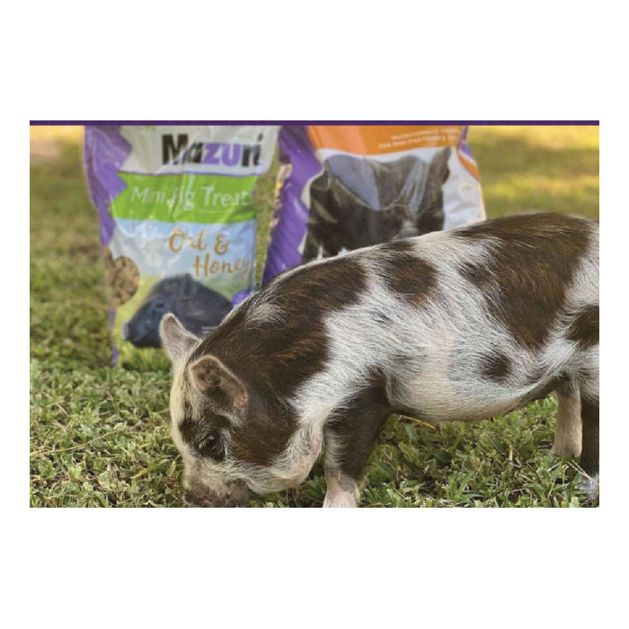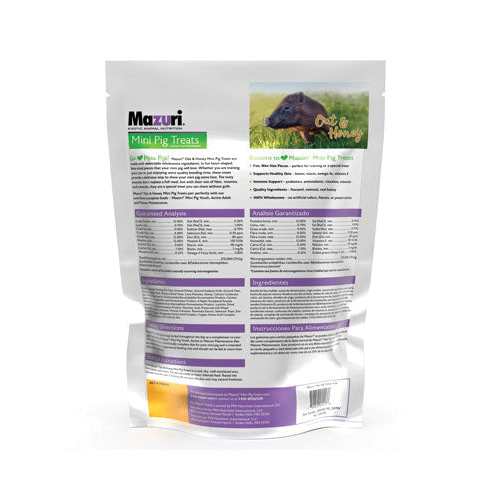 Mazuri® oat and honey mini pig treats are the excellent way to show your mini pigs some love. The tasty morsels don't replace a full meal, but with their mix of fiber, vitamins and minerals, they are a special treat you can share without guilt. Not only are these treats delicious, but they also support your mini pig's overall health. With added biotin, niacin, Omega-3s and Vitamin E, they help promote healthy skin and a shiny coat. These bite size pieces are easy for mini pigs to eat and fun for you to feed, making them ideal for training and bonding with your mini pig. Pair these mini pig treats with our nutritious complete feeds, Mazuri® mini pig youth, active adult and mature maintenance.