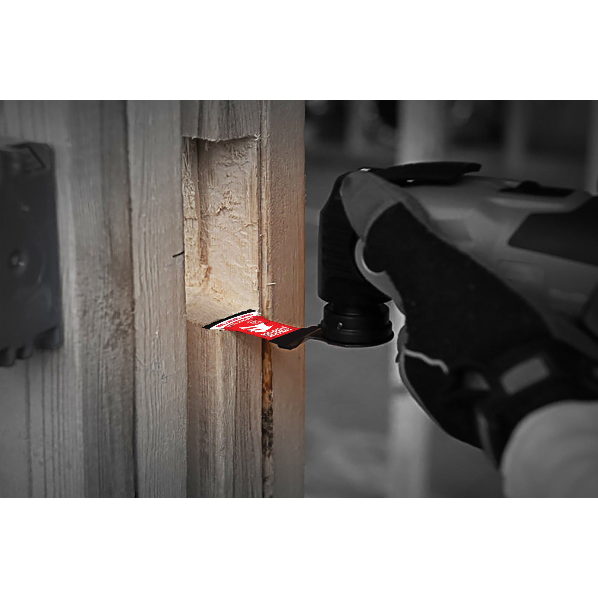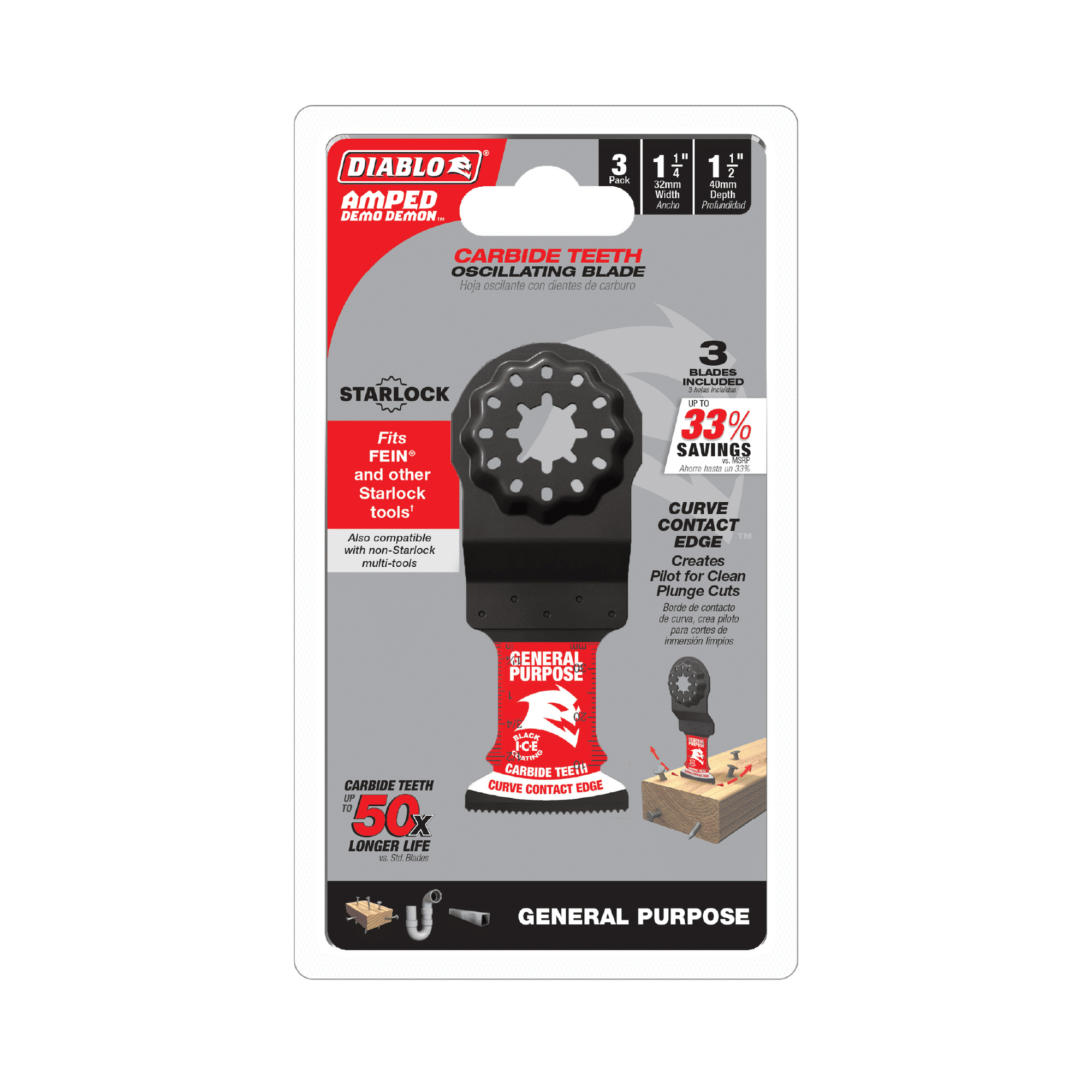Diablo's Amped™ Demo Demon® Starlock carbide teeth oscillating blades feature application specific designs that deliver extreme durability and great cutting life in general-purpose cuts: nail embedded wood, clean wood, metal and plastics. High-performance TiCo™ hi-density carbide teeth deliver an unmatched up to 50X longer cutting life versus standard bi-metal blades. Curve contact edge creates a pilot for precise, clean plunge cuts with less vibration. An optimized blade design and black I.C.E. (Industrial Cooling Element) coating protects cutting edge against wear for extreme durability and longer blade life. tool-free quick change interface fits Fein and other Starlock tools; also compatible with non-Starlock multi-tools.