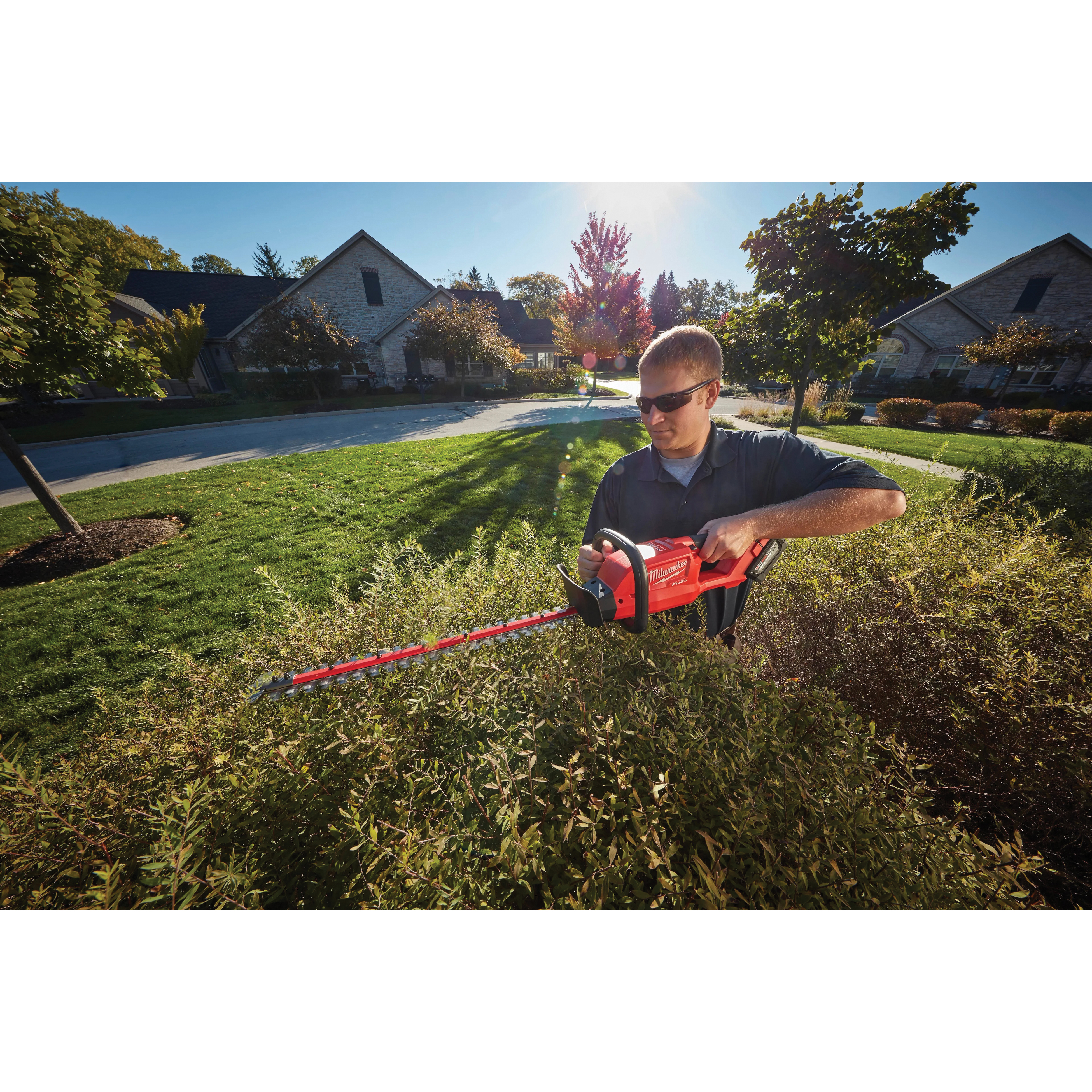 The M18 FUEL™ hedge trimmer has the power to cut 3/4 in branches, cuts up to 30% faster and provides up to 2 hr of runtime per charge. Designed to meet landscape maintenance professional needs, the handle placement and weight distribution provide the better combination of balance and control. The trimmer features a slider crank mechanism and all-metal gear case providing unmatched durability and longer life. The 24 in blade trims more material in a single pass, increasing reach and productivity. The blade tip guard prevents damage to the property and the blades. The M18 FUEL™ hedge trimmer is fully compatible with 150+ solutions on the M18™ system.