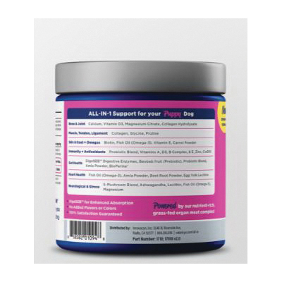 The puppy, adult and senior dog life stage formulas of ALL-IN are designed to support the key biological needs of dogs in that age group. For puppies there is a focus on reinforcing healthy growth and development. The adult formula is optimized to recharge the system and support optimal performance both inside and out. And our senior formula helps with overall mobility and provides rejuvenation for a senior dog's aging system. Plus, all formulas are packed with prebiotics and antioxidants that help overall digestive and immune health.