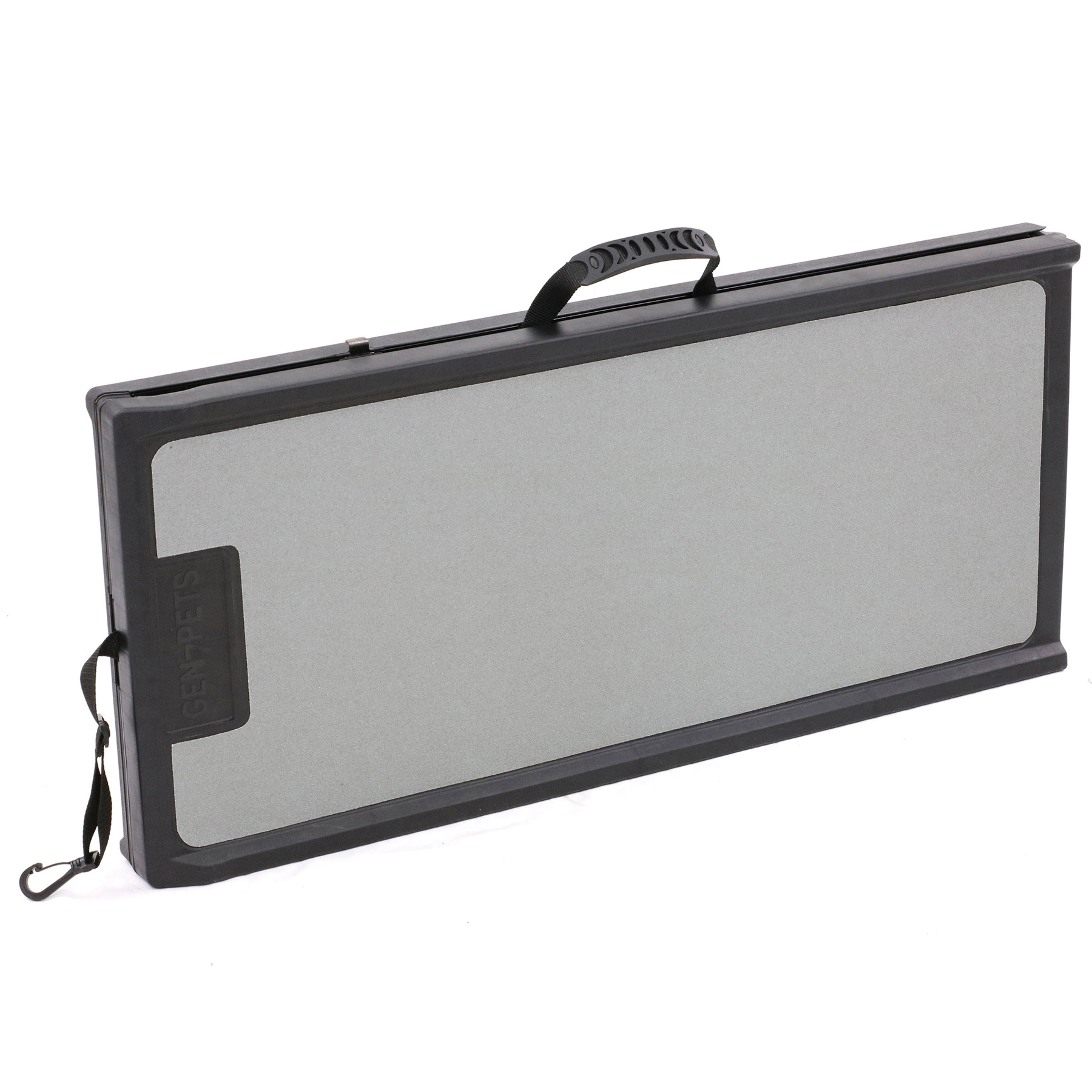 As dog's age, getting in and out of the car can become difficult, painful and hard on a dog's body. Keep them going and provide the help they need with Gen7Pets® feather lite ramp for Vehicles. The feather lite ramp features a unique sandpaper surface that allows your pet to walk up or down the ramp without slipping. Designed with a pet's safety in mind, rubber pads are mounted on both ends along with a safety tether that latches to your car's cargo area anchor to keep the ramp in place during use. When done with use, simply fold the ramp in half and the automatic locking clip keeps it from opening accidentally. A convenient rubber grip handle and the lightweight design make it easy-to-store in your vehicle's cargo area or under the back seat of your car.