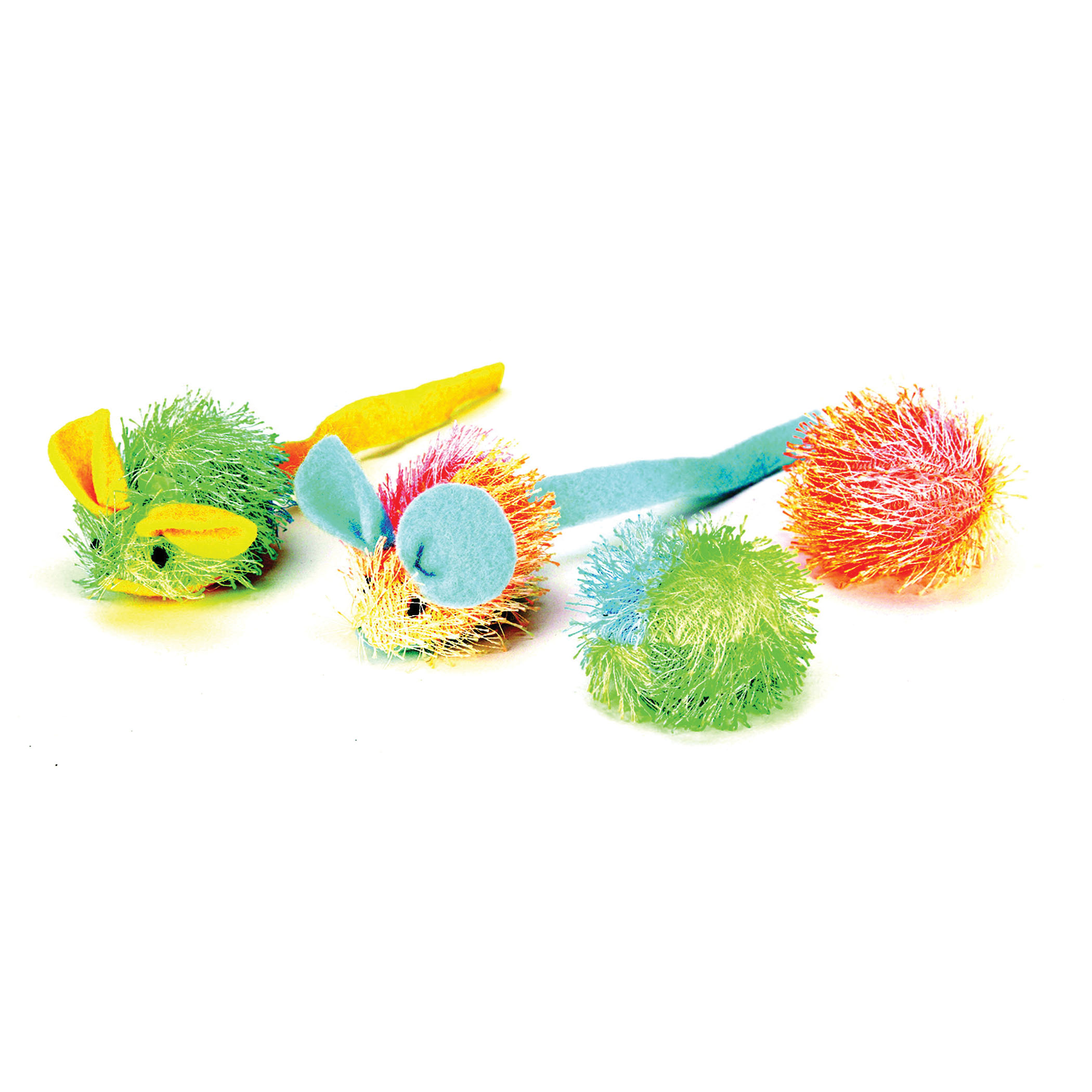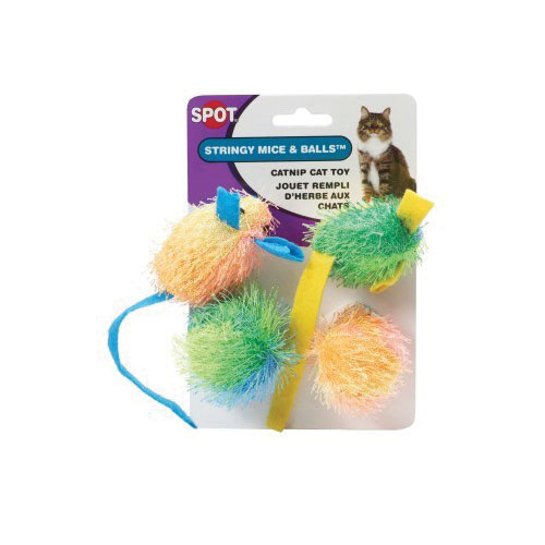 Fun colorful and stringly mice and ball four pack that contains catnip.