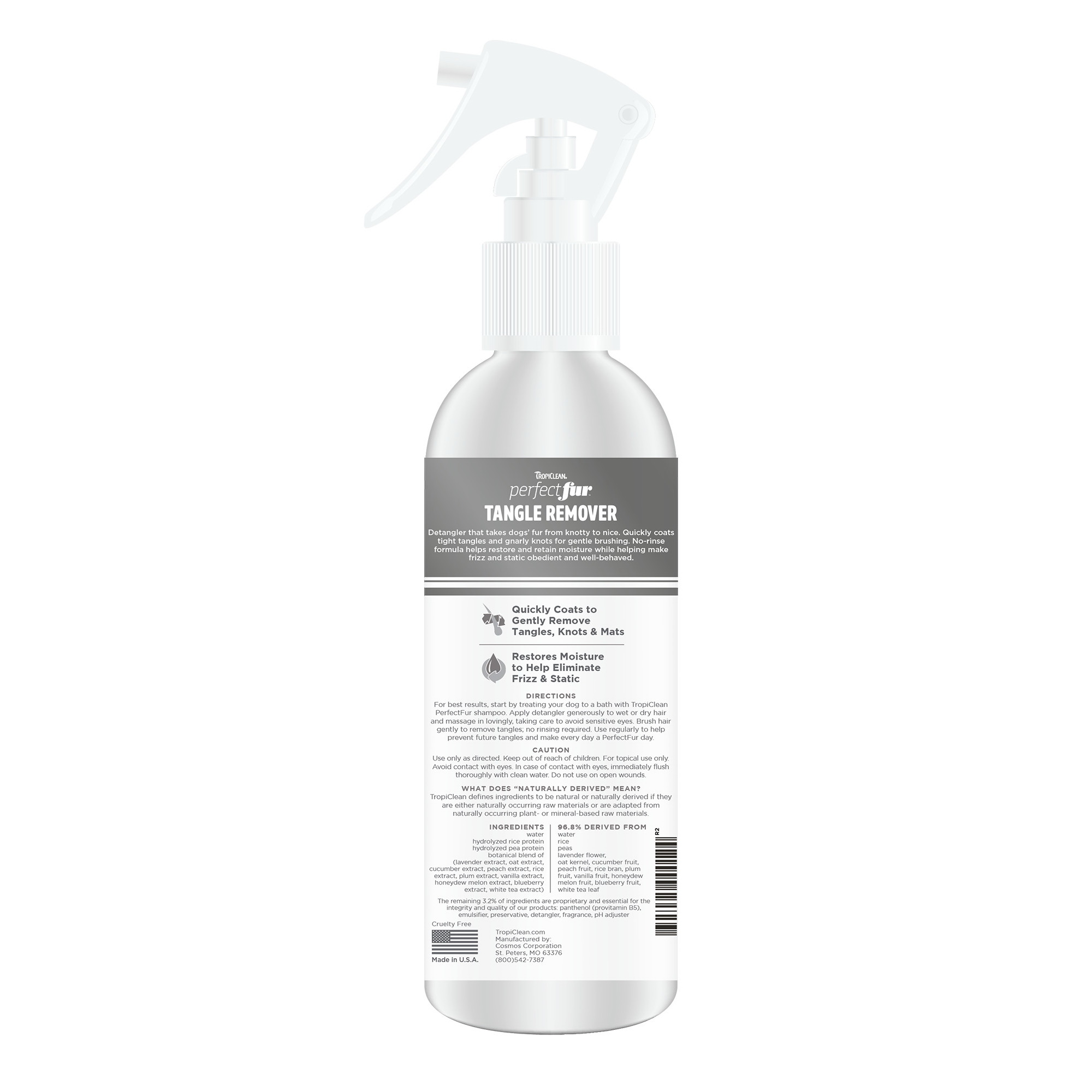 Detangler that takes dog's fur from knotty to nice. Quickly coats tight tangles and gnarly knots for gentle brushing. No-rinse formula helps restore and retain moisture while helping make frizz and static obedient and well-behaved.