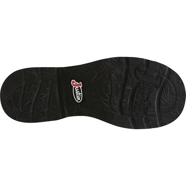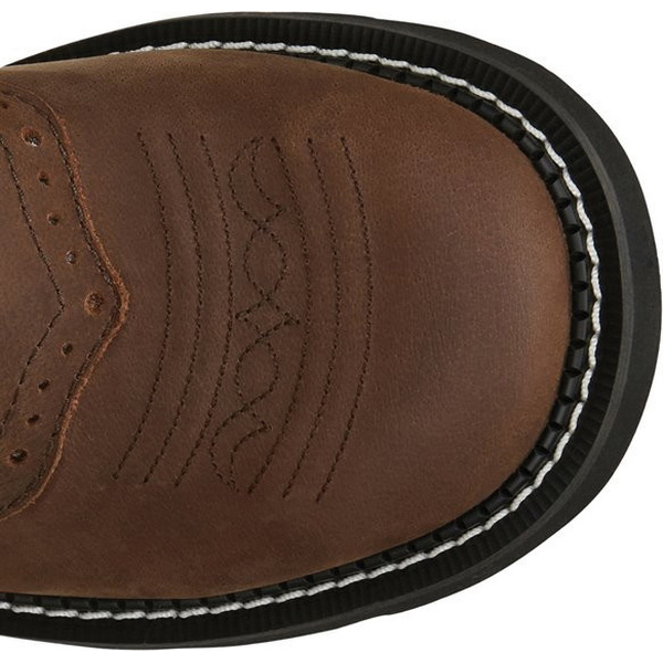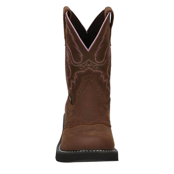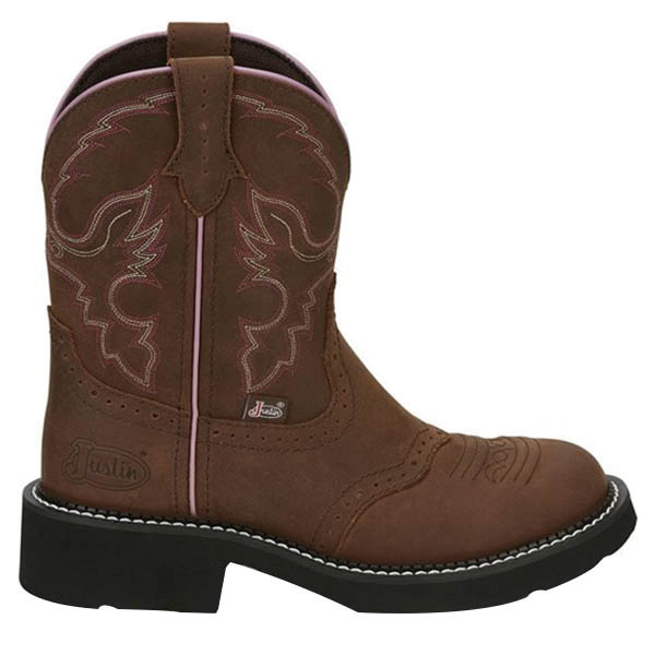 The 8 in tall Gemma aged bark Justin Gypsy™ women's cowboy boot features a chocolate brown leather exterior with a slightly vintage feel. The rustic brown provides a neutral backdrop to the hot pink and cream stitch pattern on the upper. The pastel pink seam on the quarter and trim provides an element of femininity and the diamond cut pull strap is a signature detail. Its round toe and unit heel provide an easy fit and the J-Flex Flexible Comfort System® insole with removable orthotic inserts add cushion and support in or out of the saddle.