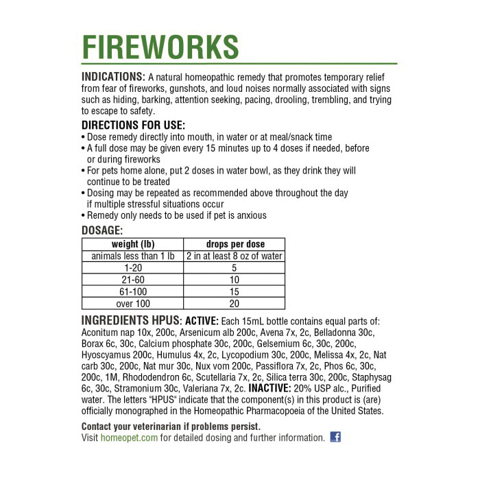 Promotes temporary relief in cats, dogs and other pets from fear of fireworks, gunshots and loud noises normally associated with signs such as hiding, barking, attention seeking, pacing and panting, drooling, trembling, trying to escape to safety.