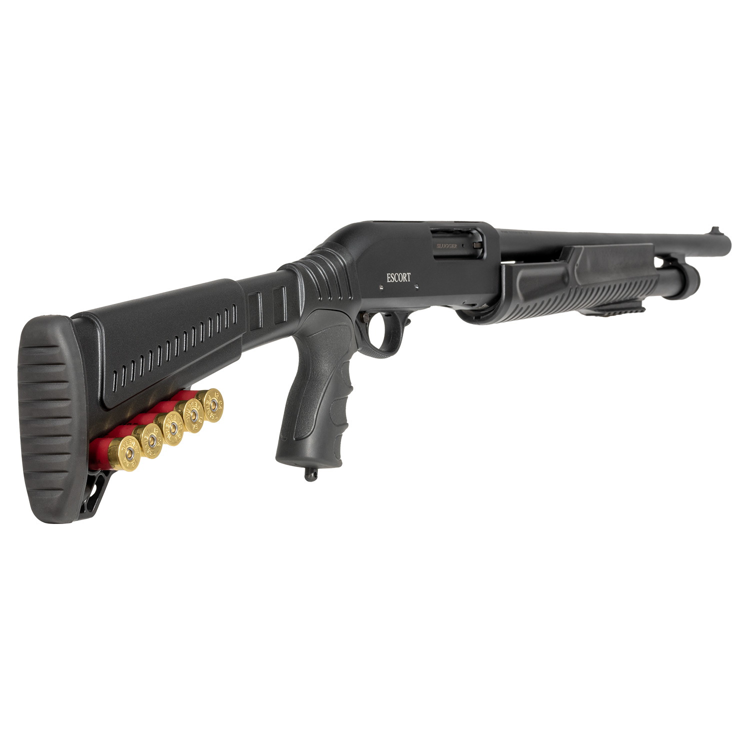 Escort Slugger Tact Shotgun, Action Type: Pump, Caliber/Gauge: 12 ga, 6, Chamber Size: 3 in, Barrel Length: 18 in, Black, 38 in OAL, Weight: 6.5 lb